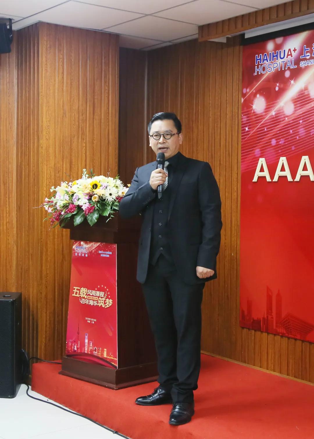 上海凯慈医疗科技发展有限公司总经理李军代表公司董事会发表致辞。他表示,感恩政府、协会各级领导对上海海华医院的扶持与帮助,感恩广大患者朋友对上海海华医院的支持与认可,感恩五年来风雨与共、携手同行的海华家人们!