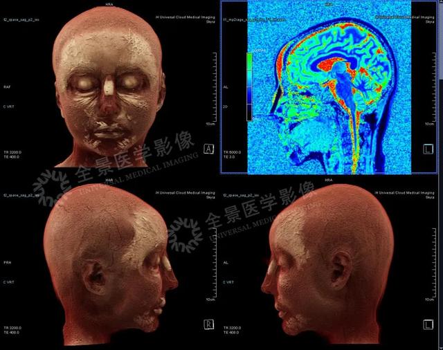 从重建图中可以直观地看到患者的额部、双侧眼睑部、双侧颧部、颞部、鼻部、唇部及下颌周围皮下分布的异常信号(考虑为植入物),同时 T1 mp2rage 序列(右上)可以量化组织的 T1 值,便于直观反映各组织的 T1 值,精确判断植入物目前的状态和降解吸收情况。