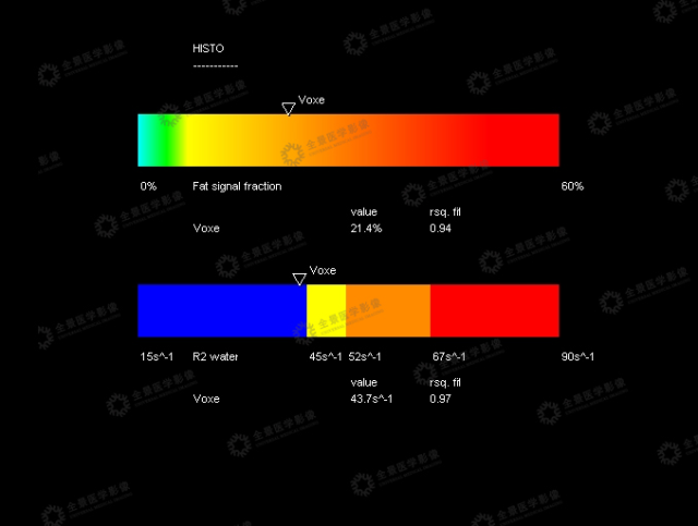 即水脂分离技术,通过对同、反相位图像进行相加和相减,从而得到水相图和脂相图,此序列对于肝脏脂肪变性的判定更加直观,但是容易受磁场均匀度的影像,此后的三点法水脂分离技术(iterative decomposition of water and fat with echoasymmetry and least—squares estimation,IDEAL)可以克服磁场的不均匀性,从而使脂肪定量的测定结果更加准确,此序列可以收集六个TE回波时间,最后通过图像处理得到同相位图、反相位图、水相图、脂相图、脂肪分数图、R2*图,其一次屏气即可得到全肝序列影像,采集时间短,使用配套处理软件可对选定ROI的脂肪分数进行计算。