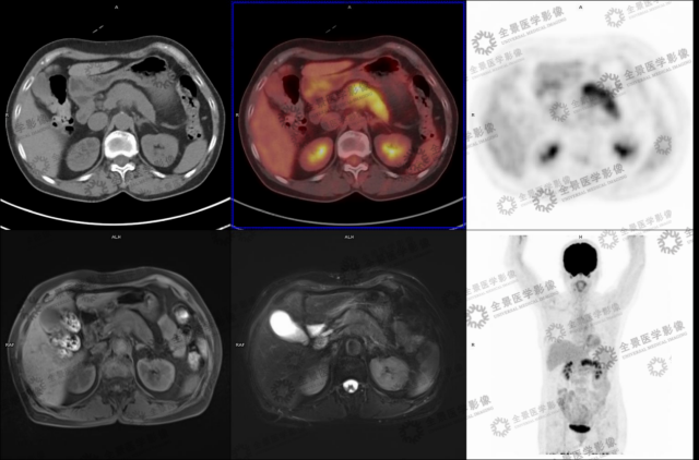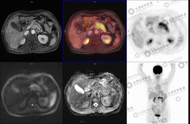 胰腺癌中导管细胞癌是最主要的病理类型,约占 90%。典型的影像表现为乏血供,无包膜,易侵犯神经和神经周围淋巴管。MR 增强可以明确显示出病灶的血供情况以及周围组织的侵犯情况。胰腺癌的淋巴及血行转移较早,PET/CT 检查多数表现为高代谢,对远处转移的检出有帮助。