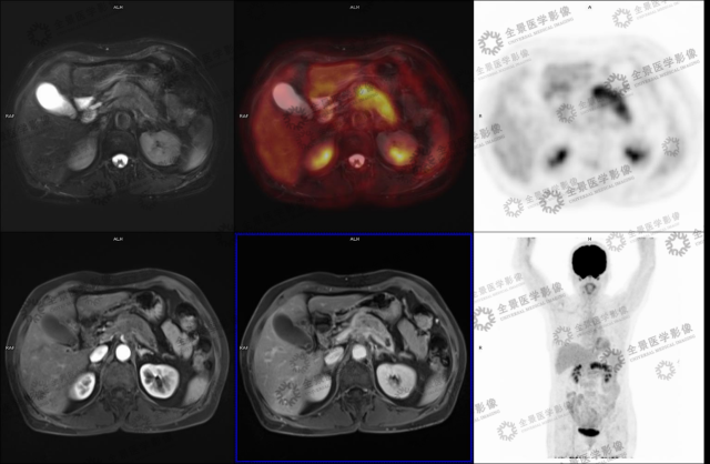 检查者当天先后分别进行 MR 增强及 PET/CT 检查,受检者血糖为正常值,静脉注射 18F-FDG,静息 45~60 min 后行常规 PET/CT 扫描。常规 PET/CT 扫描,CT 平扫层厚 3 mm;PET 扫描层厚 3 mm。MR 增强检查:选用增强造影剂钆双胺注射液进行上腹部常规增强扫描方式(动脉期 20~30s,门静脉期 50~60S,平衡期约 3 min)。