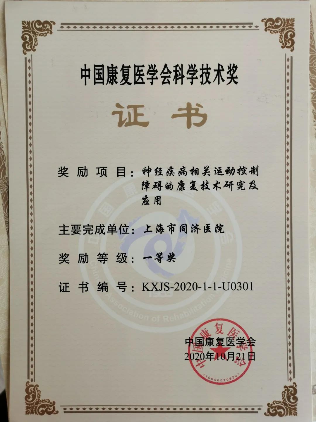 由同济大学附属同济医院靳令经教授团队牵头联合复旦大学附属华山医院、上海市养志康复医院(上海市阳光康复中心)完成的项目《神经疾病相关运动控制障碍的康复技术研究及应用》荣获中国康复医学会科学技术奖一等奖,本次获奖为靳令经教授团队于今年获得上海市康复医学科技奖一等奖,上海医学科技奖青年奖之后的第三个获科技成果奖。