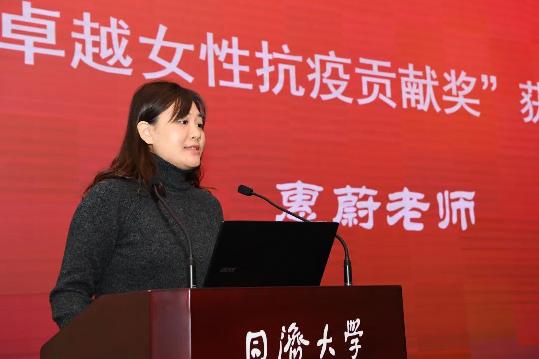 2020 年 12 月 18 日,以「卓越女性成才之路」为主题的同济大学第六届女教师论坛暨卓越女性颁奖典礼在同济大学四平路校区逸夫楼一楼报告厅线上、线下同步举行,100 余位女教职工、女大学生代表参加了四平路校区现场活动,上海市妇女联合会发来贺信,校党委副书记吴广明出席颁奖典礼。同济大学附属同济医院 RICU 护士长惠蔚同志获得「2020 同济大学卓越女性抗疫贡献奖」。