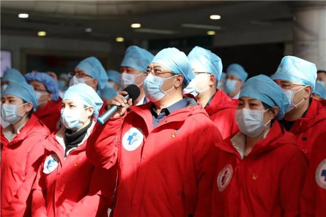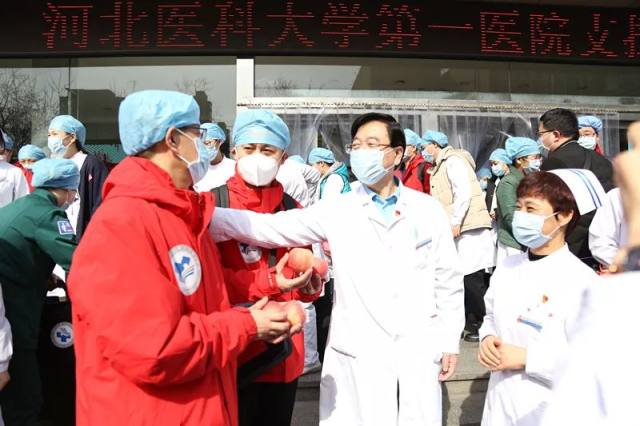 河北医科大学党委常委、副校长、第一医院党委书记张振宇在讲话中表示,「今天你们即将代表河北、医科大学、医大一院出征湖北,共同抗击疫情。