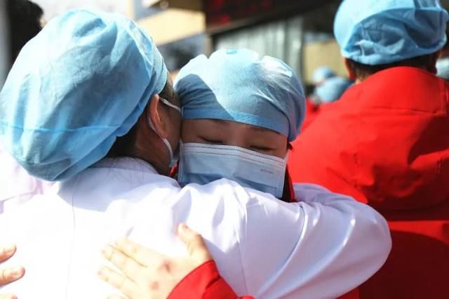 第八批支援武汉医疗队队长、医大一院副院长张庆富的爱人是内分泌科主任周慧敏,相顾无言却又千言万语,紧紧一个拥抱,却很有爱。