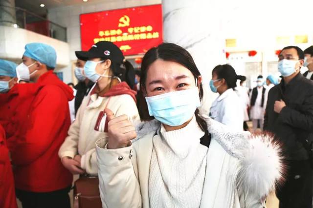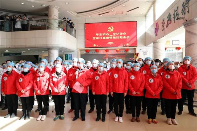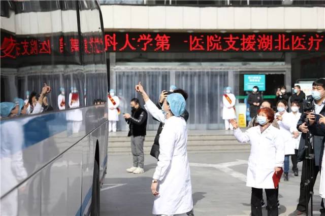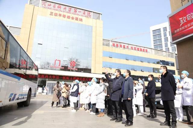 2 月 21 日中午 1 点,医大一院为第二批支援武汉医疗队在医院门诊大厅举行了简短而隆重的出征仪式。