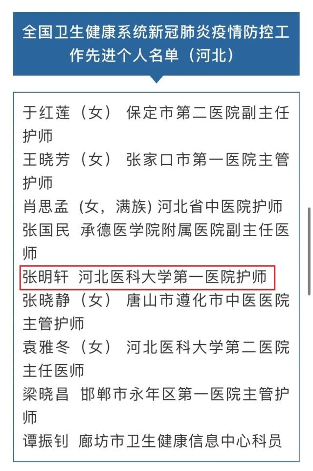 河北医科第一医院重症医学科护师张明轩荣获「全国卫生健康系统新冠肺炎疫情防控工作先进个人」称号。