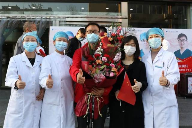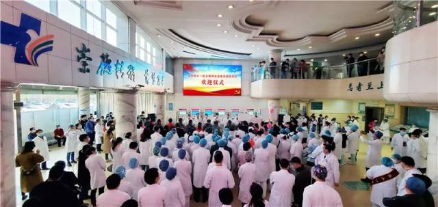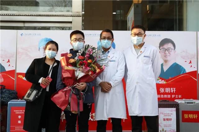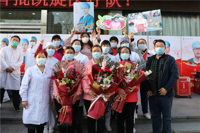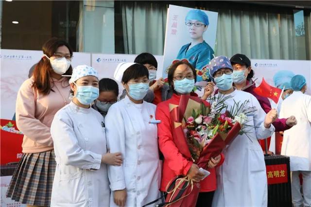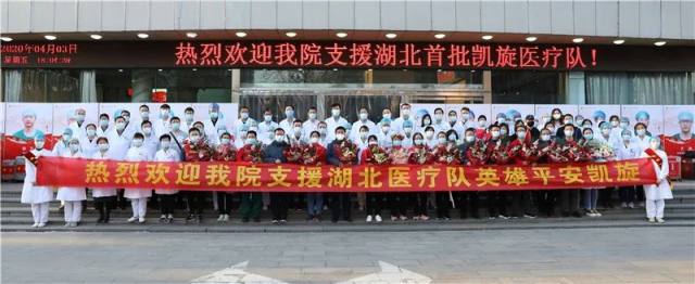 4 月 3 日,河北医科大学第一医院支援湖北医疗队第一批返程队员结束为期 14 天的隔离。我院在门诊大厅举行欢迎仪式,迎接 15 名队员回家。河北医科大学党委常委、副校长、我院党委书记张振宇,院长赵增仁等全体院领导及职能部门负责人、队员科室主任、护士长、家属代表等参加。