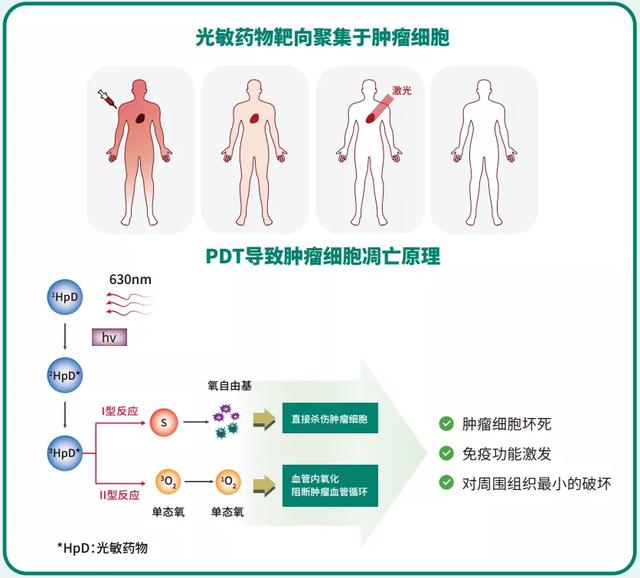 光动力治疗法是一种经注射光敏剂后,利用激光照射治疗恶性肿瘤的新技术。具有高选择性、副作用小,疗效确切,无耐药性,可重复治疗,同时兼顾保护器官功能等优点,是一种新型的靶向治疗技术。