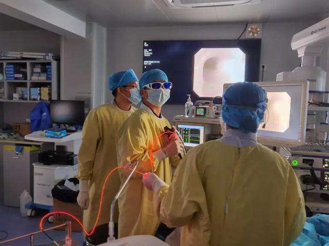 再次与患者及其家属详细说明治疗方案并征得知情同意后,由马礼兵带领的呼吸介入治疗团队为患者施行了呼吸内镜引导下光动力治疗消瘤术。由于患者术前 48 小时已注射光敏剂,需要避光保护,术中关闭了手术室所有光源,仅剩操作显示器的屏幕亮光,顺利完成了此次手术。