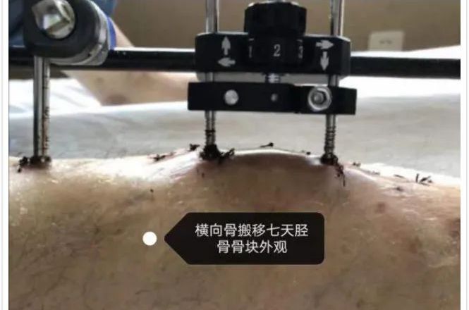Ilizarov 技术横向骨搬移,是在患者右小腿部通过牵拉骨块,可以从胫骨骨髓腔内重新生成一套微血管系统,于末端微细血管融合,从而重新改善下肢血液循环,使因部分闭塞造成的缺血坏死组织趋于缓解直至痊愈。