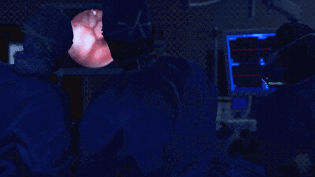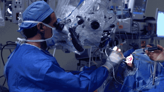 这时,Badie 博士开始对一个大型的显微镜进行操纵,将其放置在患者大脑开口的上方。