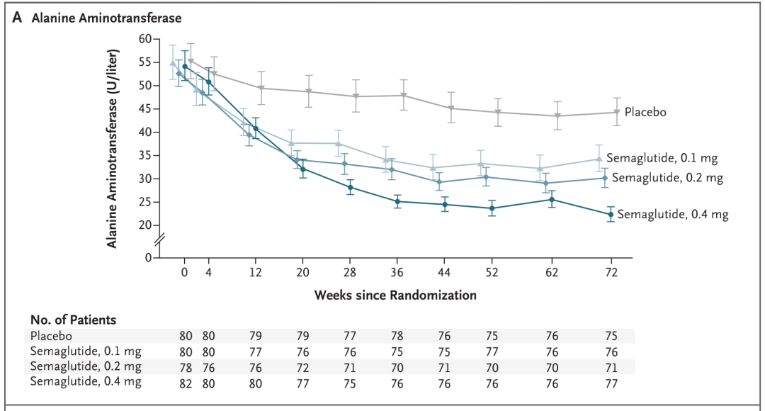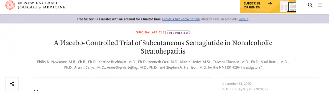2020 年 11 月 13 日,一项关于索马鲁肽治疗非酒精性脂肪性肝炎为期 72 周的 2 期随机、双盲、安慰剂对照的临床试验在线发表于《新英格兰医学杂志》(NEJM),每日一次皮下注射 0.4 mg 索马鲁肽(semaglutide)可以使 59% 的 NASH 缓解且无纤维化恶化。索马鲁肽是第一个获得美国 FDA 批准的口服胰高血糖素样肽-1 受体激动剂类药物,用于控制 2 型糖尿病患者的血糖。