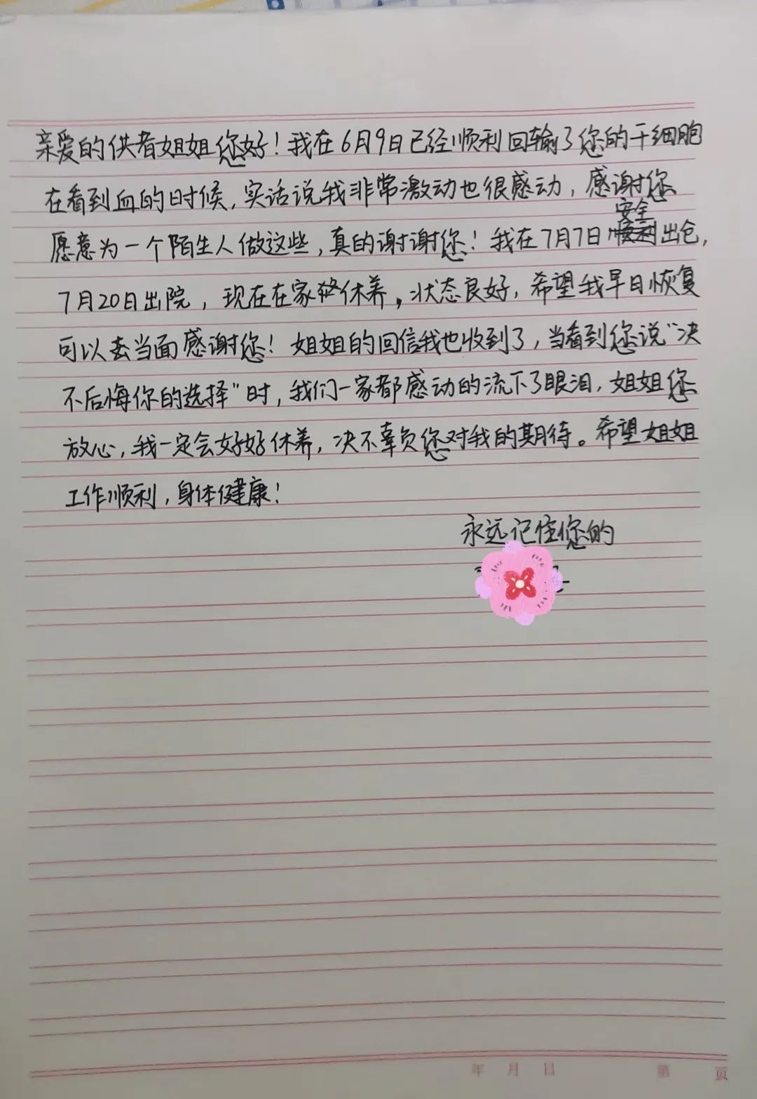 我在 7 月 7 日安全出仓,7 月 20 日出院,现在在家休养, 状态良好, 希望我早日恢复可以当面感谢您!姐姐的回信我也收到了, 当看到您说「决不后悔你的选择」时, 我们一家都感动的流下了眼泪。姐姐您放心,我一定会好好休养,决不辜负您对我的期待。希望姐姐工作顺利,身体健康!