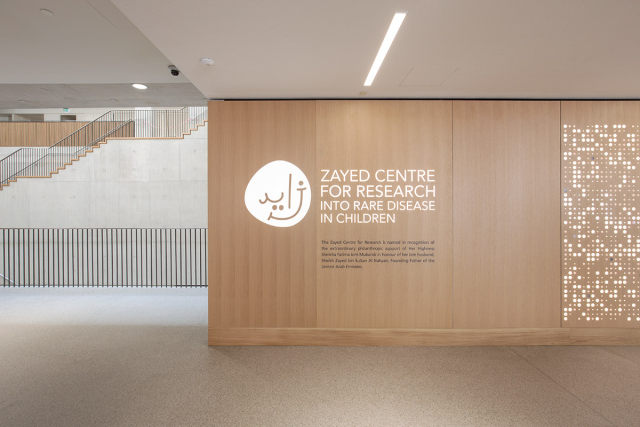 特别建造的扎耶德研究中心紧邻英国伦敦大奥蒙德街儿童医院 (GOSH) 及伦敦大学学院大奥蒙德街儿童健康研究所,将世界开创性的儿科研究项目和临床护理聚集在一处,是世界上第一个专注于儿童罕见病的研究中心。它的投用将大大有助于推动针对儿童罕见病的新颖治疗方法的开发,并帮助更多来自英国和国际的重症患儿。