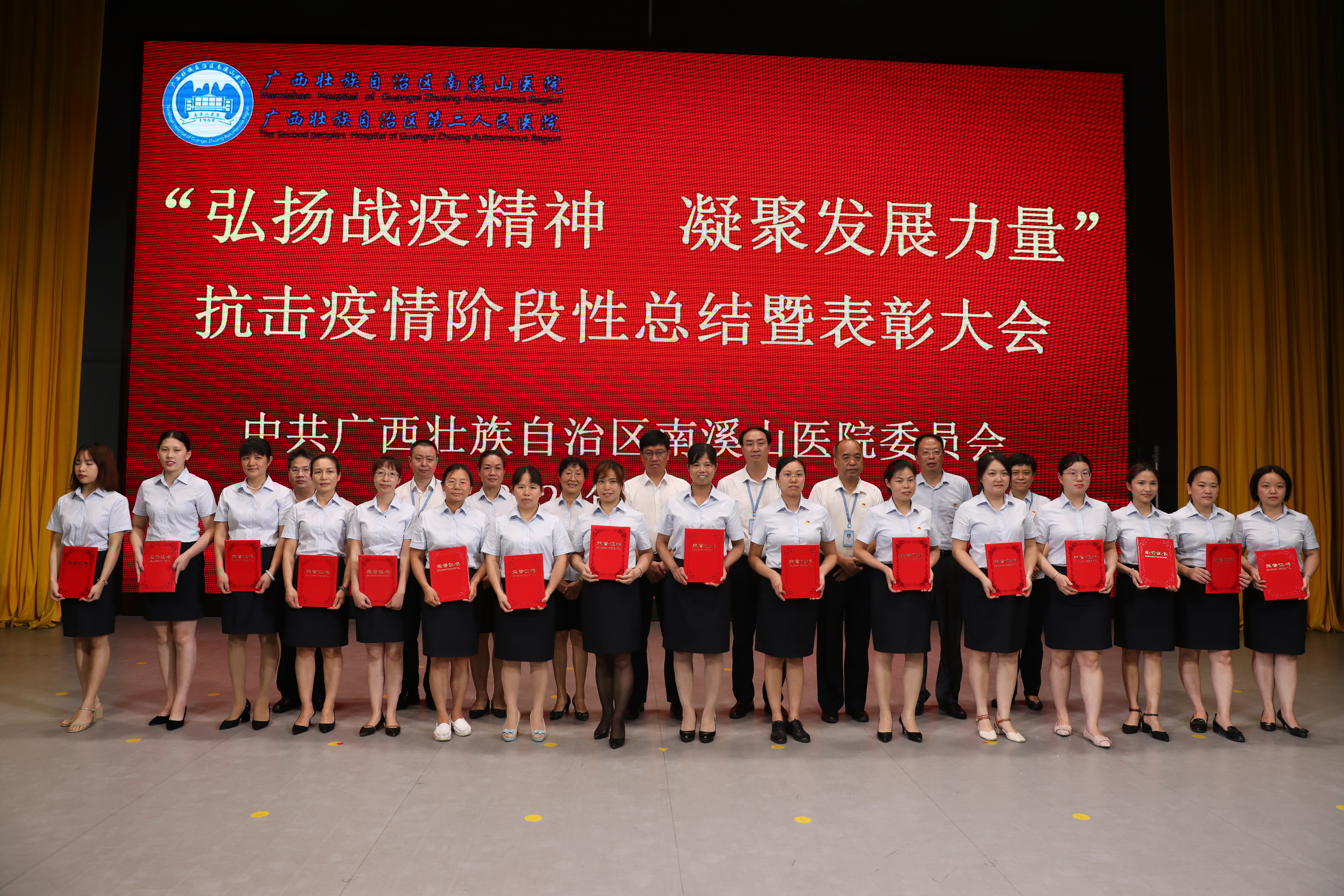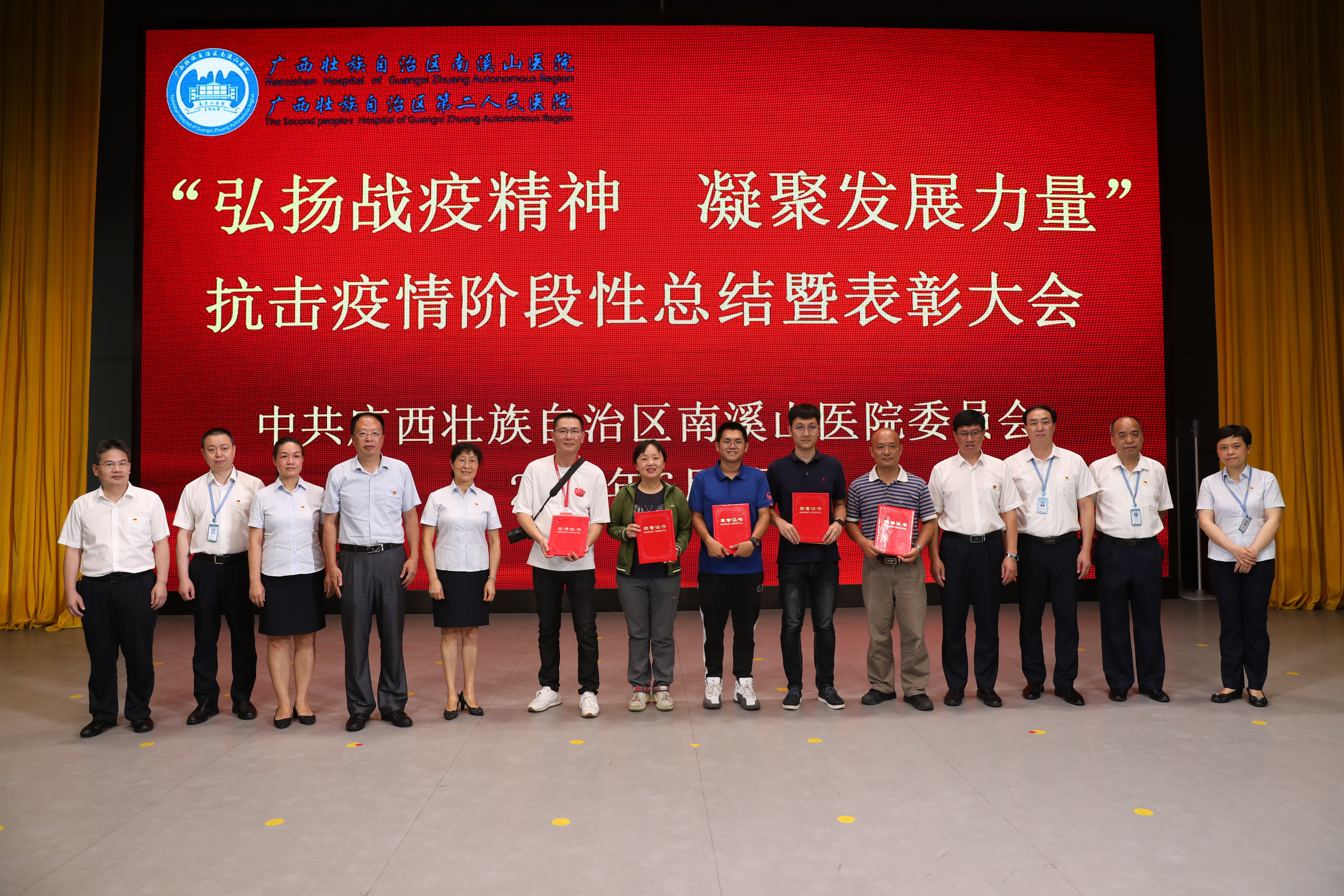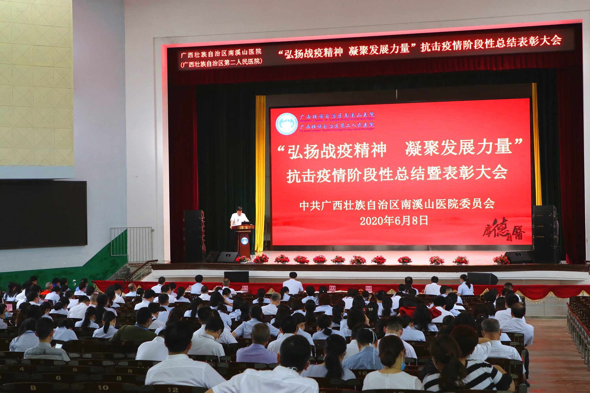 6 月 8 日,广西壮族自治区南溪山医院在大礼堂召开「弘扬战疫精神 凝聚发展力量」抗击新冠疫情阶段性总结暨表彰大会,对全院抗击疫情工作进行阶段性全面总结,并对在抗击新冠疫情斗争中涌现出的先进集体、先进个人进行表彰。医院全体党政领导班子成员、各党支部书记、中层干部、医务人员代表共计 400 余人参加大会;党委书记戴前富以《撑起桂北一片天》为题作专题报告,党委副书记、院长刘宇军宣读表彰决定,党委副书记郑江萍主持会议。