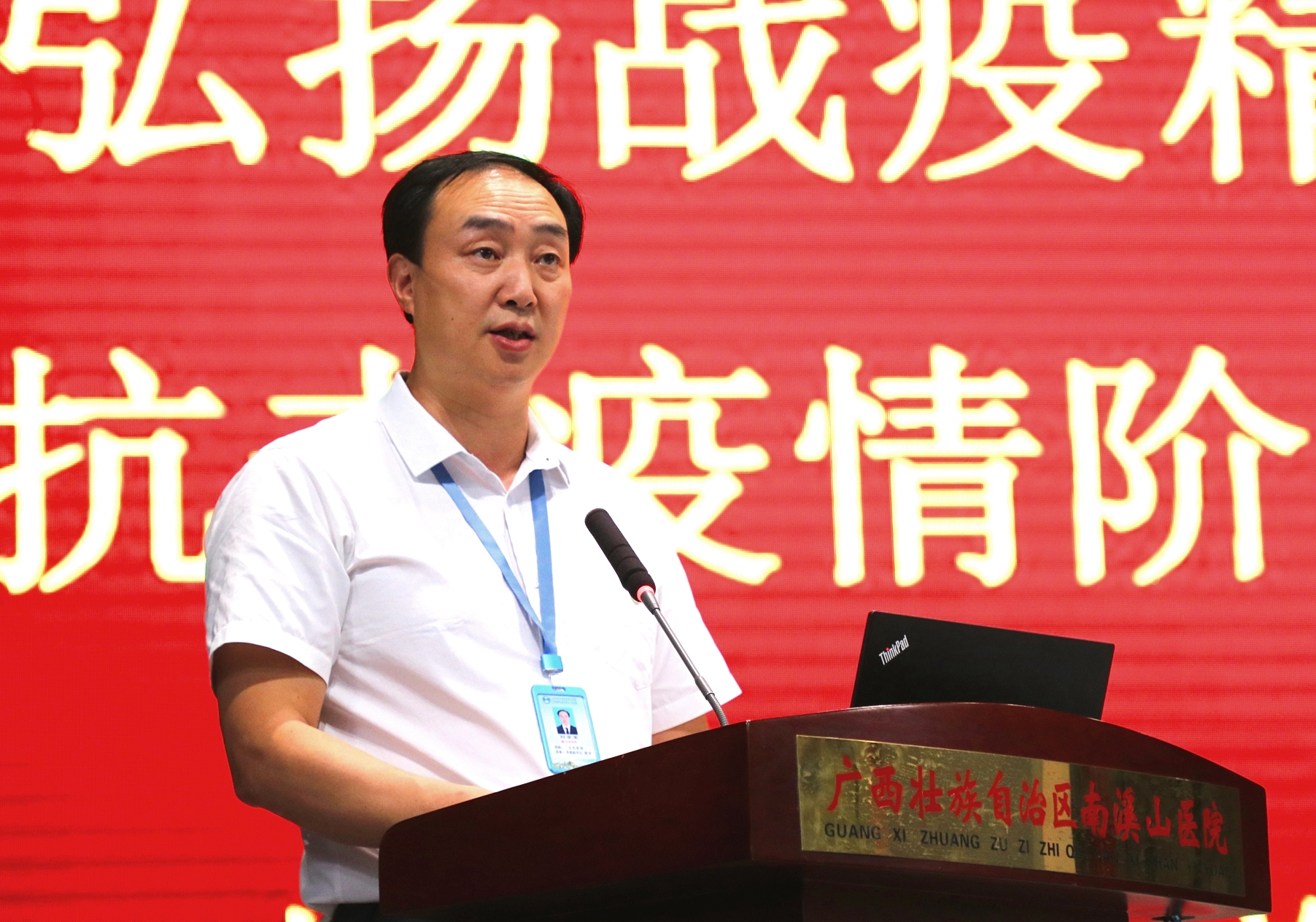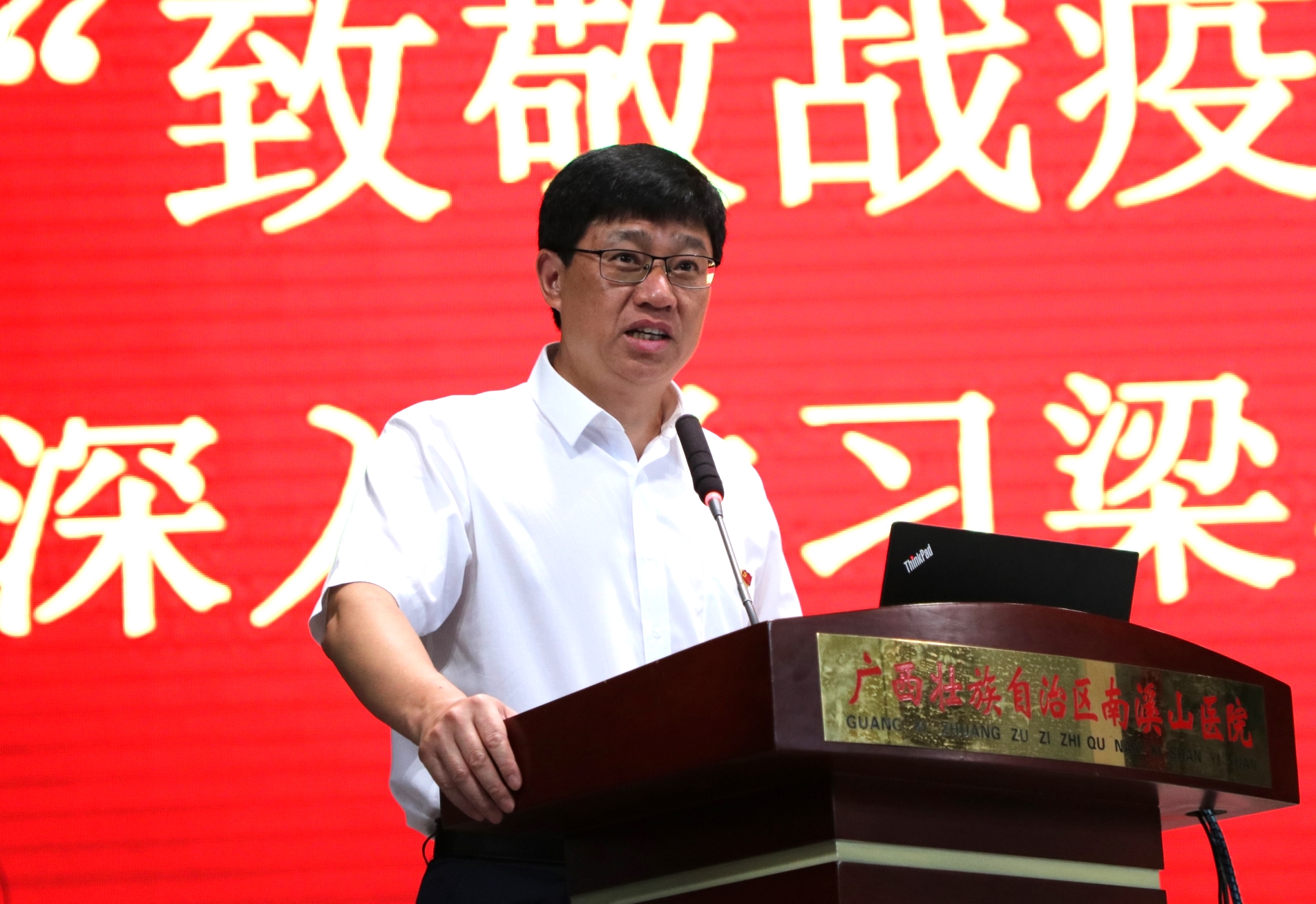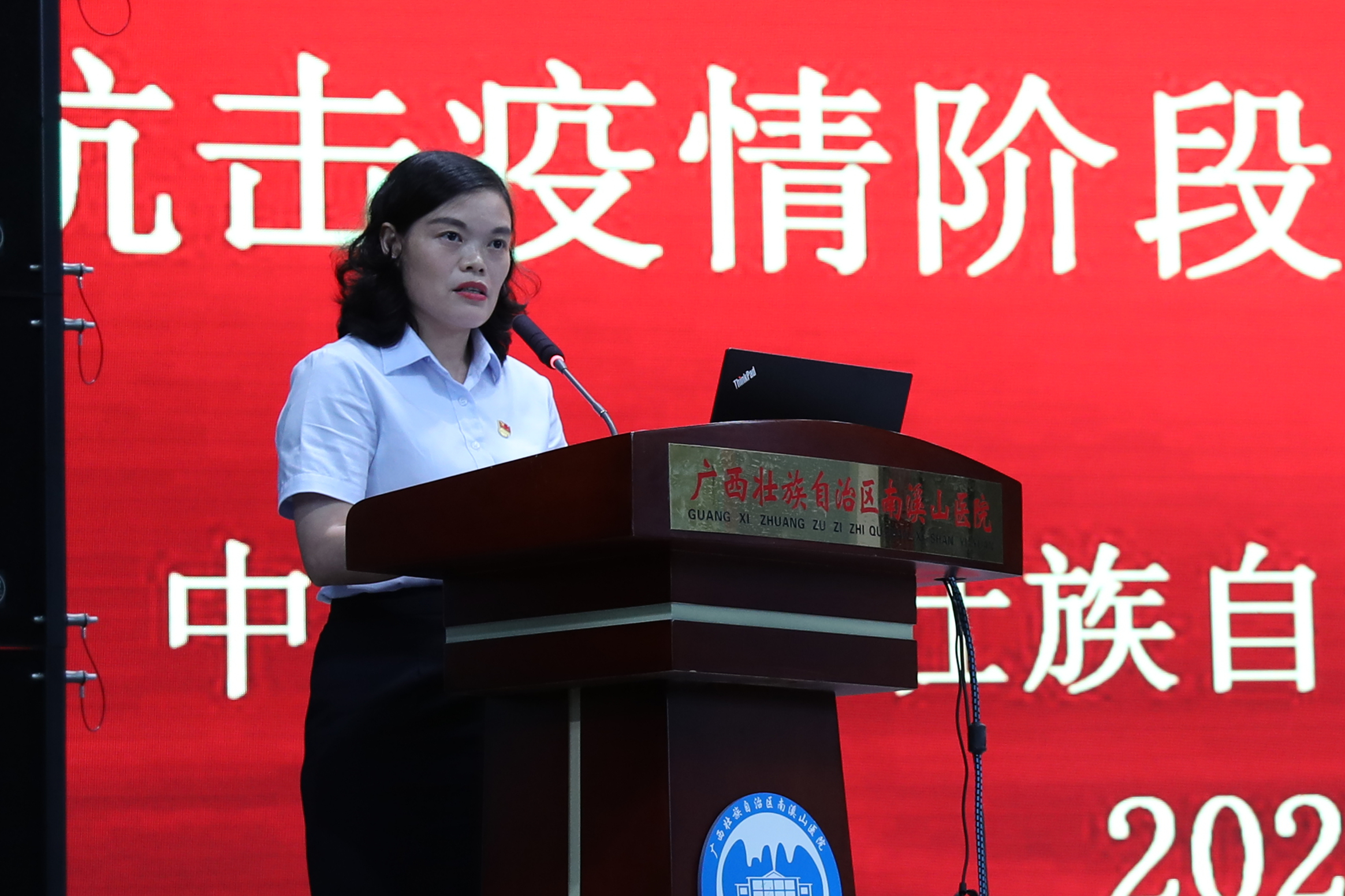 6 月 8 日,广西壮族自治区南溪山医院在大礼堂召开「弘扬战疫精神 凝聚发展力量」抗击新冠疫情阶段性总结暨表彰大会,对全院抗击疫情工作进行阶段性全面总结,并对在抗击新冠疫情斗争中涌现出的先进集体、先进个人进行表彰。医院全体党政领导班子成员、各党支部书记、中层干部、医务人员代表共计 400 余人参加大会;党委书记戴前富以《撑起桂北一片天》为题作专题报告,党委副书记、院长刘宇军宣读表彰决定,党委副书记郑江萍主持会议。