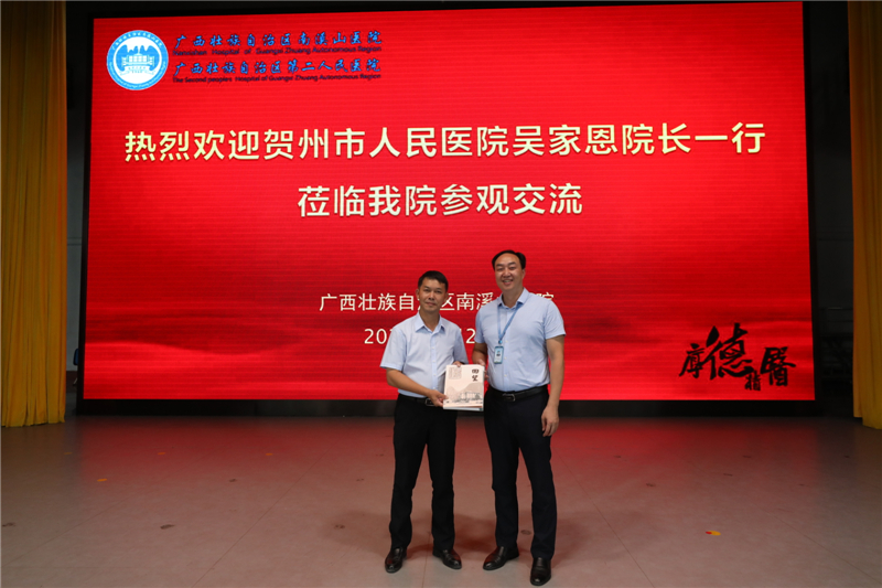 会上,刘宇军院长首先致欢迎辞,对贺州市人民医院顺利通过国家「三级甲等」综合医院现场评审表示祝贺。随后,他介绍了南溪山医院的基本情况和抗疫期间该院作为新冠肺炎病人定点医院,在医院党委的领导下以高度的政治责任感,不计代价、不讲条件、不惜全力,全院党员、干部职工坚守在第一线,在 50 余天里,收治新冠肺炎确诊病例 23 人,实现全部患者治愈出院,无死亡病例,无医务人员感染,守护桂北,驰援湖北,医疗援柬,三线作战担当作为的大爱事迹;贺州市人民医院院长吴家恩在会上高度赞扬了南溪山医院在他们医院评审三甲的时候给予的帮助,希望此次来院能更好地学习南溪山医院作为三甲医院成熟的管理经验和优秀的医院文化建设;对南溪山医院抗击新冠的优秀表现表示由衷的敬佩。