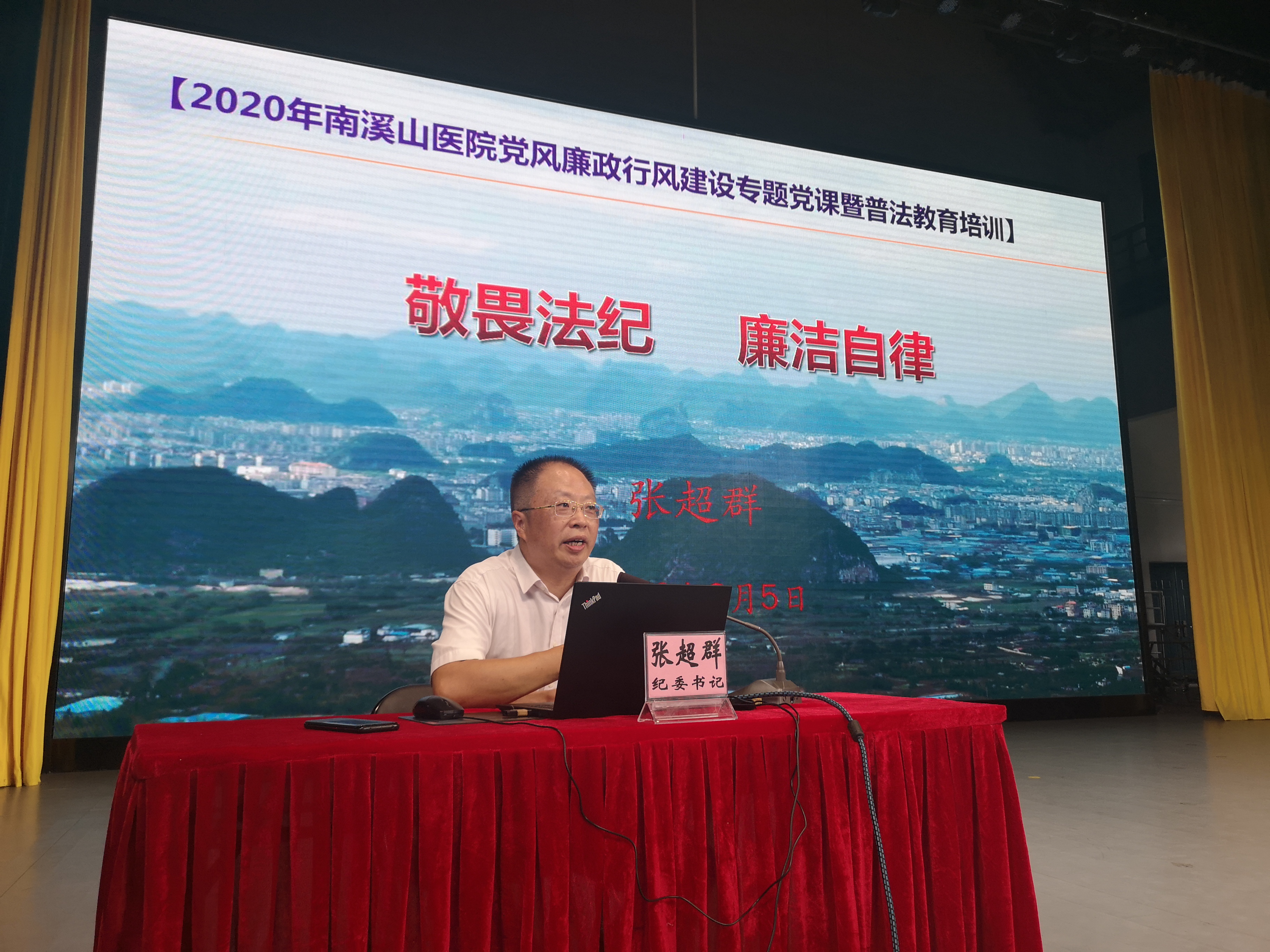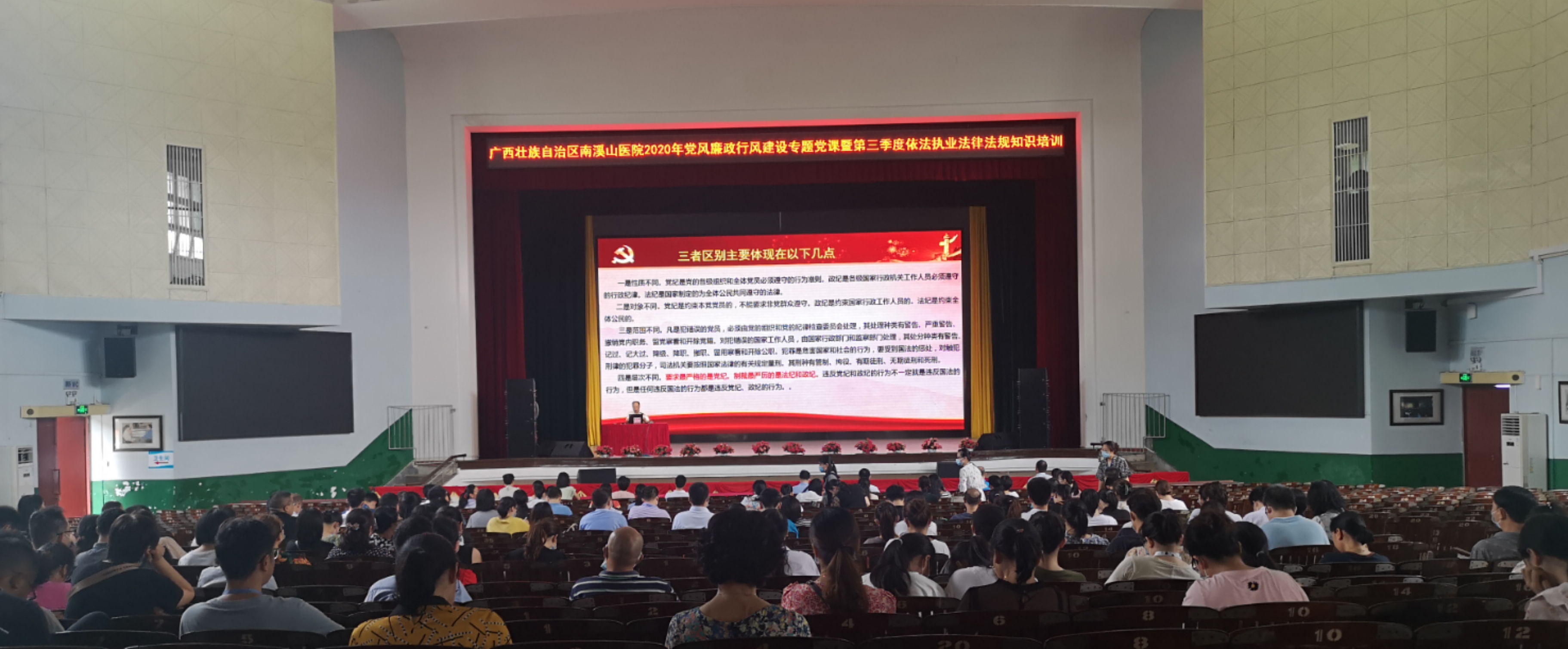 为加强法制教育, 强化全院职工的法律意识,进一步推进医院的党风廉政、行风建设和反腐败工作的开展。8 月 5 日,广西壮族自治区南溪山医院纪委书记张超群同志受邀在该院 2020 年党风廉政行风建设专题党课暨第三季度依法执业法律法规知识培训,为 456 名干部职工以《敬畏法纪,廉洁自律》为题,作了党风廉政和普法学习的专题讲座。