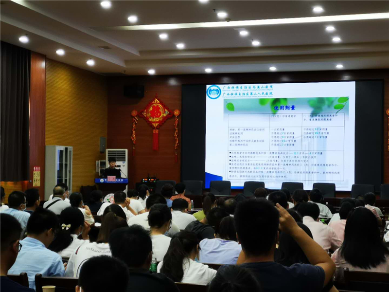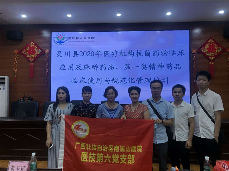 8 月 7 日,受医联体单位——桂林市灵川县人民医院之邀,广西壮族自治区南溪山医院药学部主任黄玉斌带领药学部 5 名党员专家一同前往该院开展党建联学活动,就抗菌药物临床应用和麻醉药品、精神药品的使用和管理等知识进行授课培训,整个会议厅座无虚席,学员们收获满满。