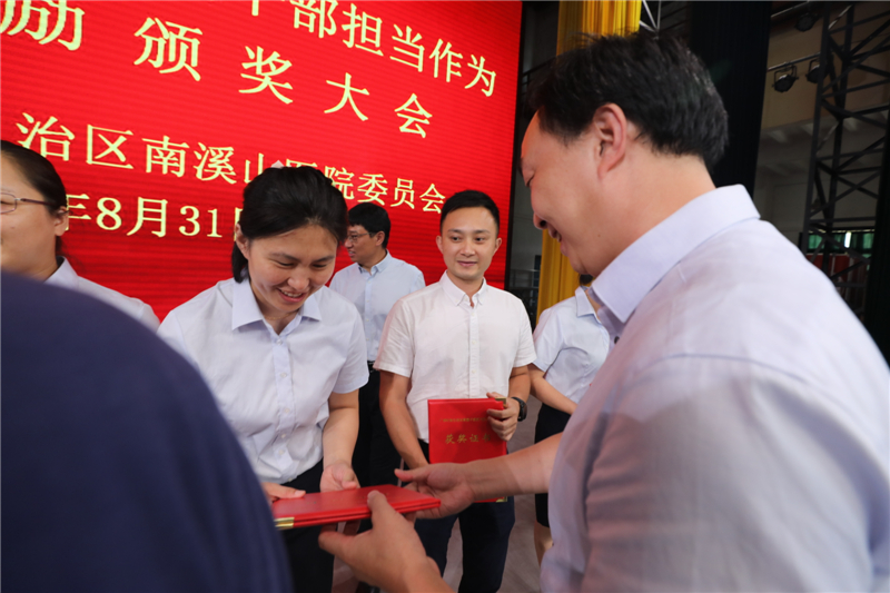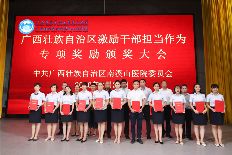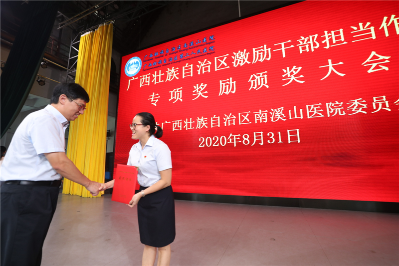 8 月 31 日下午,自治区南溪山医院在该院大礼堂隆重举行颁奖大会,为荣获 2020 年度广西壮族自治区激励干部担当作为专项奖励的 13 名职工进行颁奖。