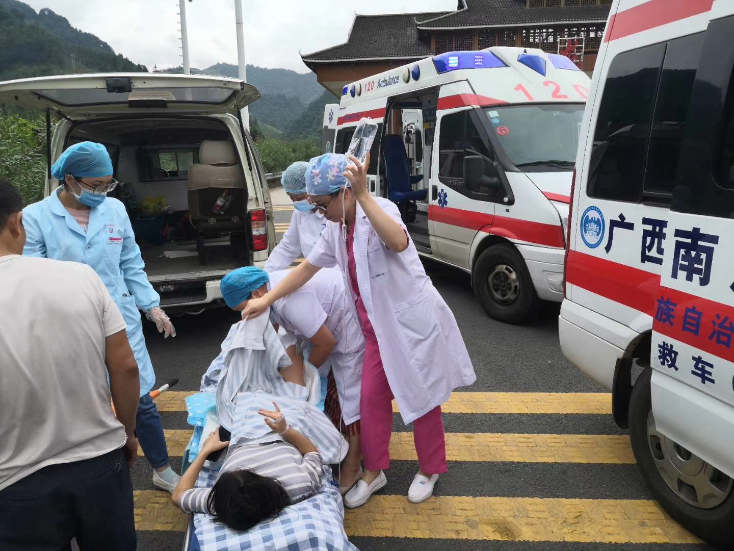 上午 11 点左右,在龙胜县高速路口收费站,南溪山医院的救护车与龙胜县幼保健院运送孕妇及家人的救护车准时碰头。接上孕妇之后,自治区南溪山医院的救护车立马掉头上高速往回赶。在路上,王丽医师与黄永昌医师等医务人员对孕妇进行了会诊和处理,并通过不断安慰鼓劲及时稳定住了孕妇和家属的情绪,缓解了他们的焦虑心情。