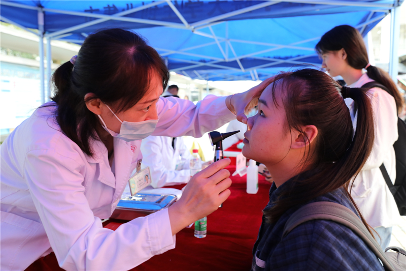 南溪山医院耳鼻喉科医生为学生检查鼻腔