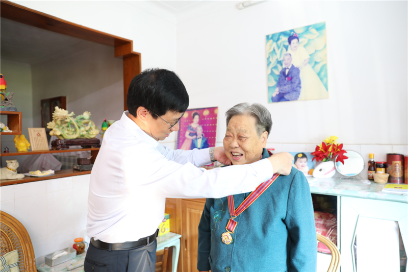 在王婉秋家中,戴前富书记详细询问了王老的身体、生活状况,感谢她为国防建设和家乡发展的奉献,不停地嘱咐她保重身体,并亲自为她佩戴纪念章。抚今追昔,戴书记向王老感叹道:「没有抗美援朝战争的伟大胜利,就不可能有今天党和人民事业蓬勃发展的大好局面,就不可能有中华民族的伟大复兴,你们的卓越功勋,党和人民永远不会忘记!」
