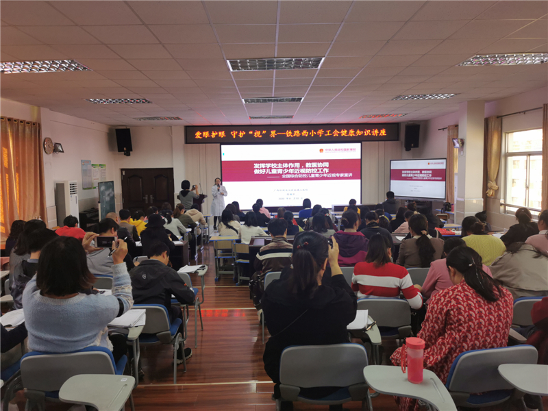 2020 年 11 月 10 日下午,广西壮族自治区南溪山医院眼科副主任蒋艳华应邀来到铁路西小学,为学校师生开展「爱眼护眼,科学防控近视」主题讲座,旨在普及科学用眼知识,提升青少年的爱眼护眼意识,促进青少年养成良好的用眼卫生习惯,正确保护眼睛,预防近视。