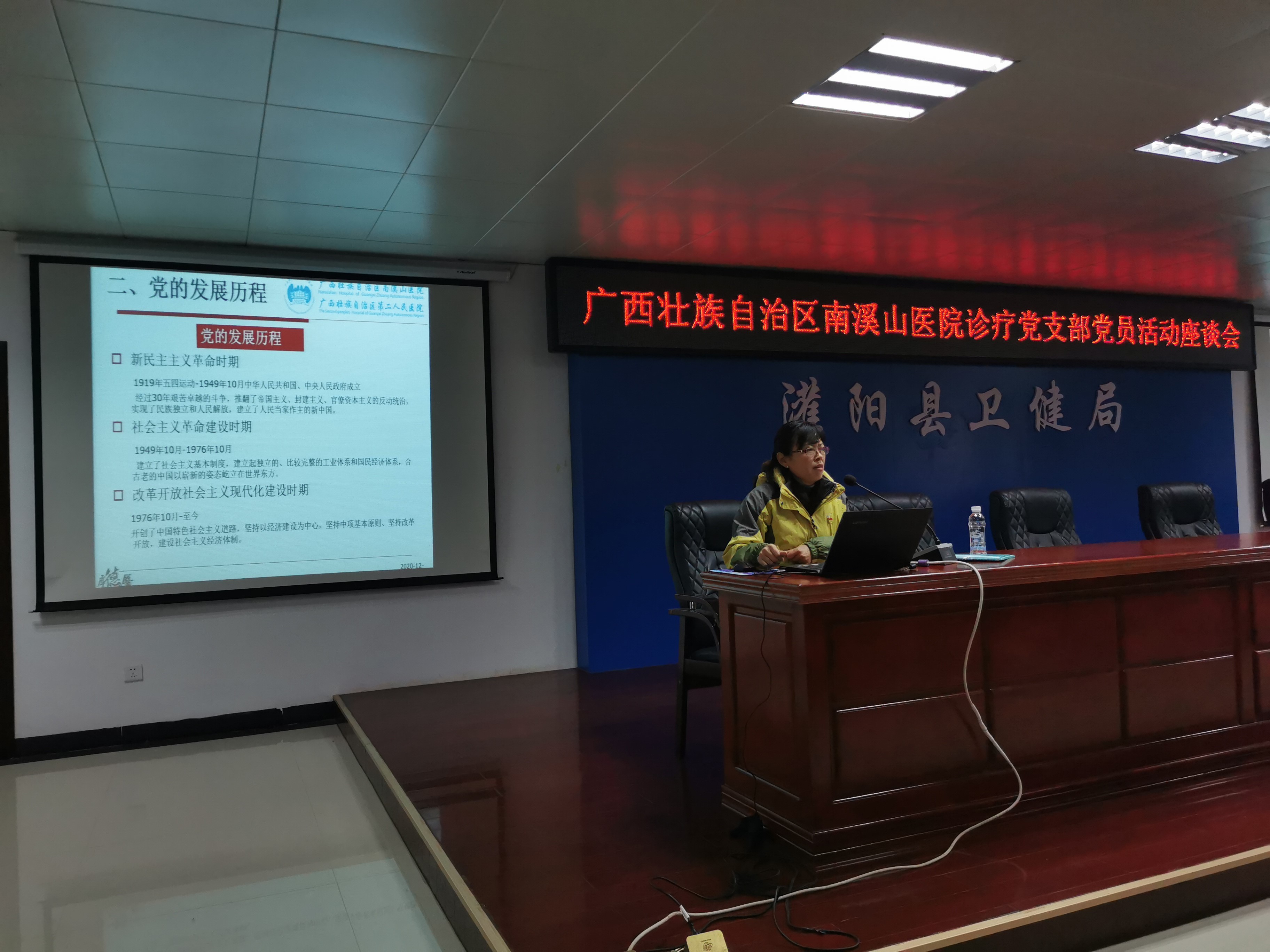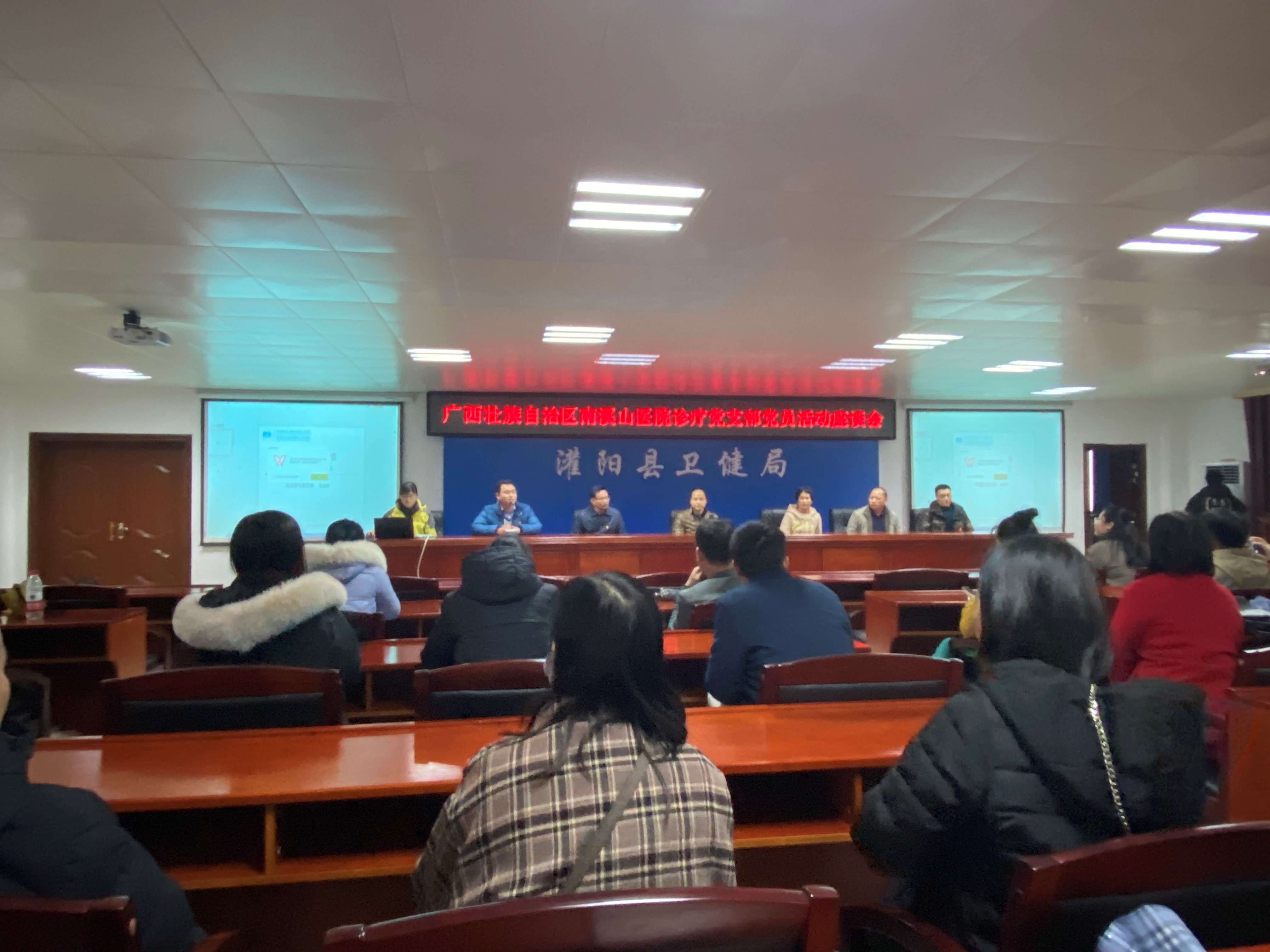 下午 15:00,一行人来到了灌阳县卫生健康局七楼会议室开展主题党日交流活动,卫健局陈局长和陈主任对南溪山医院医技各党支部到来表示热烈欢迎,并与各党支部党员干部进行了党建工作的座谈交流。