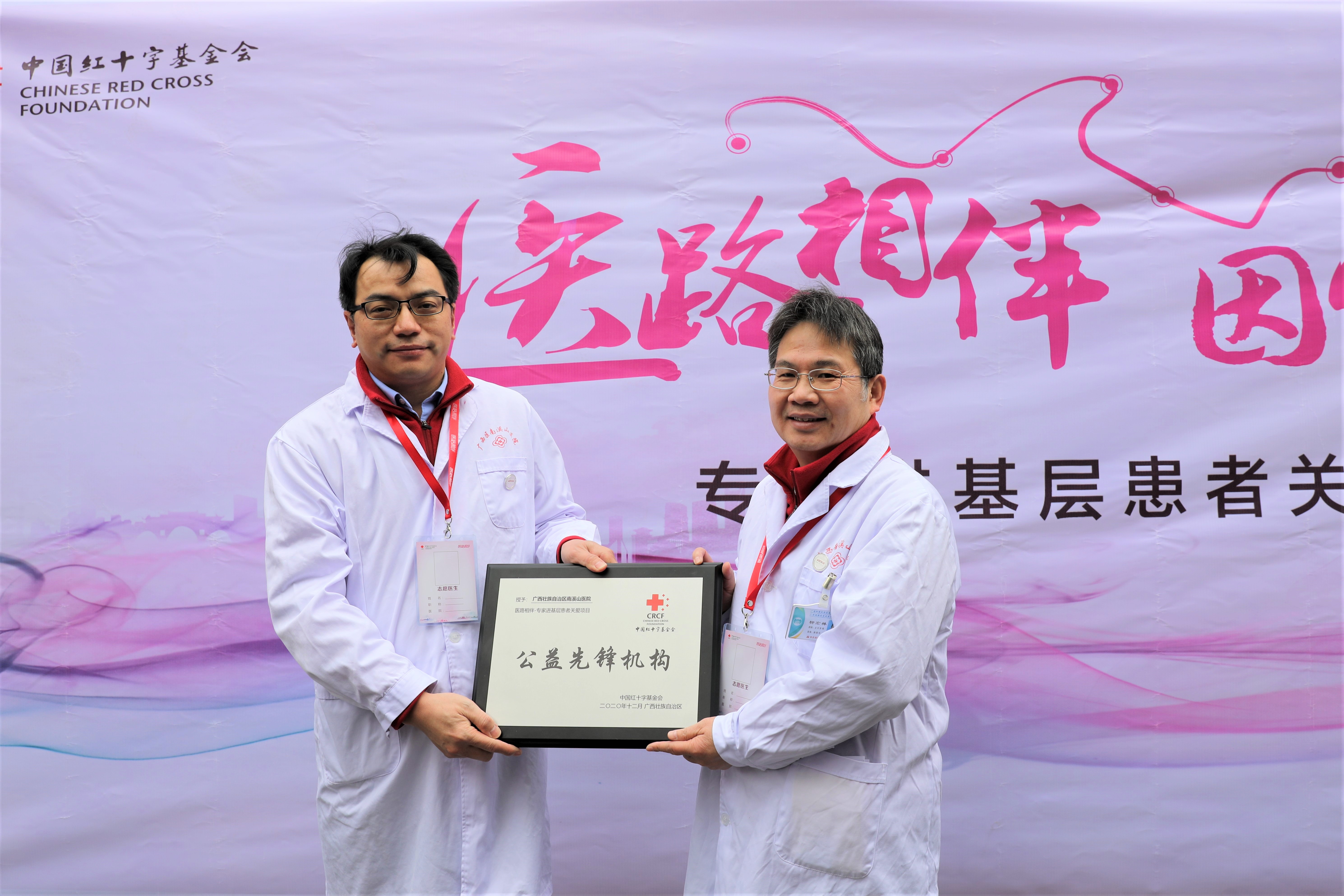 随后,他代表中国红十字基金会授予暨南大学附属第一医院主任医师王宁霞、中山大学附属第七医院主任医师庞俊、广西医科大学附属肿瘤医院主任医师阳志军、广西医科大学附属肿瘤医院主任医师张洁清「公益先锋人物」奖牌,南溪山医院获得「公益先锋机构」荣誉奖牌。阳志军代表中国红十字基金会下基层专家一行发言时对此次活动给予了高度肯定。