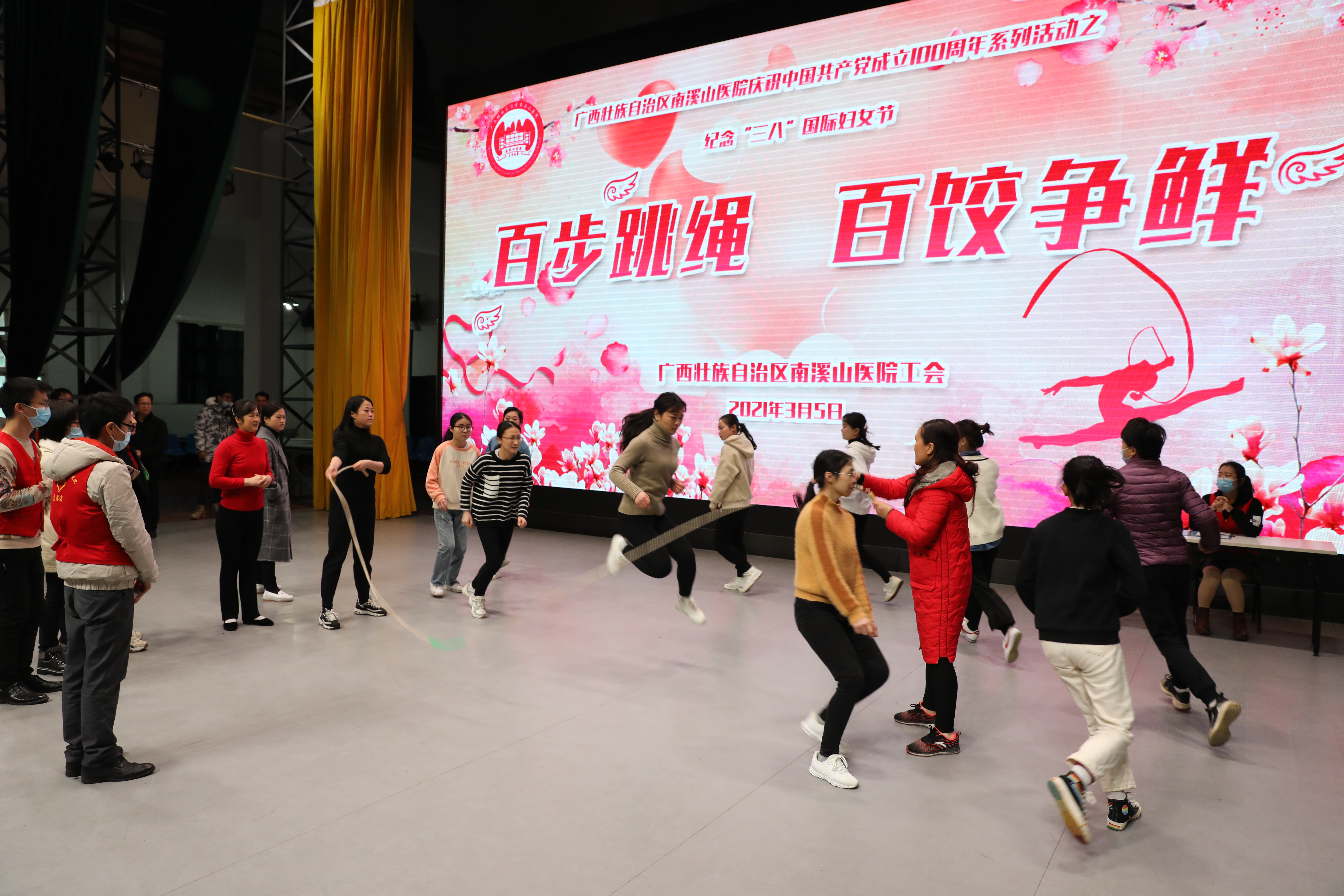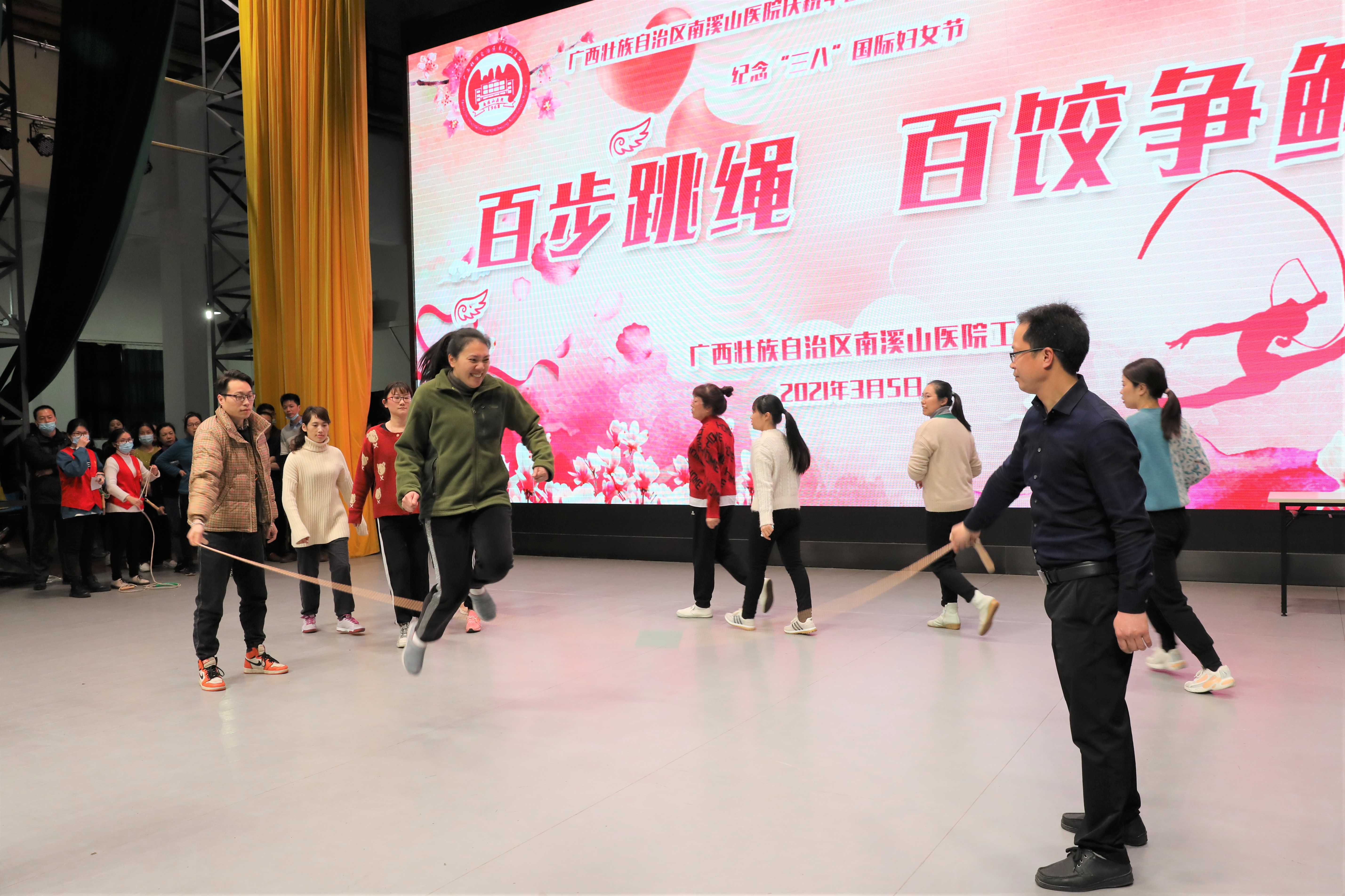 3 月 5 日,广西壮族自治区南溪山医院在该院大礼堂举办「百步跳绳▪百饺争鲜」趣味比赛,庆祝即将到来的「三八」国际劳动妇女节,活动吸引了全院广大女职工踊跃参与,营造了浓浓的节日气氛。