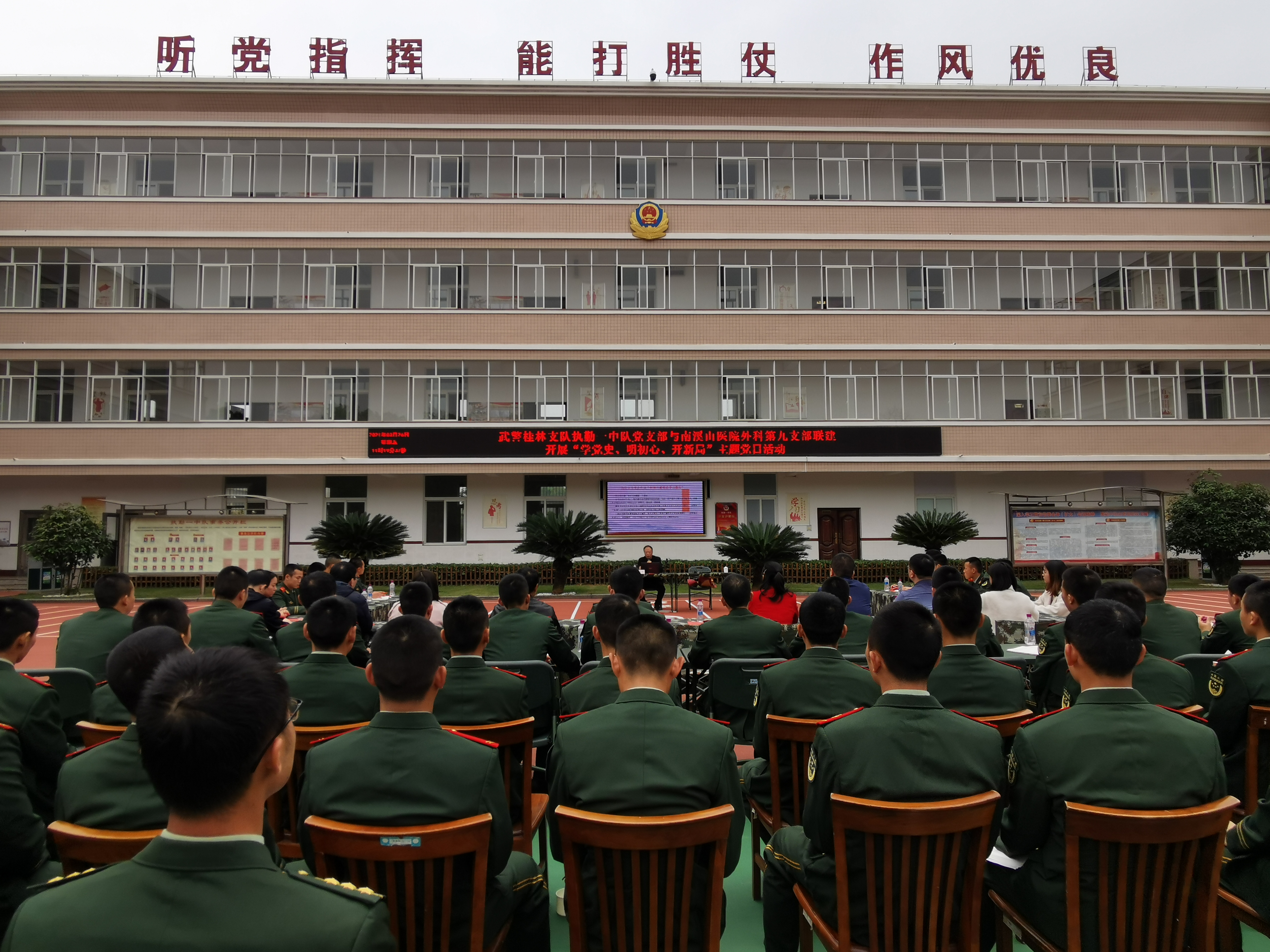 3 月 26 日,武警桂林支队执勤一大队执勤一中队党支部邀请共建单位---------自治区南溪山医院外科第九党支部的党员走进军营开展「学党史、明初心、开新局」党员主题日活动。