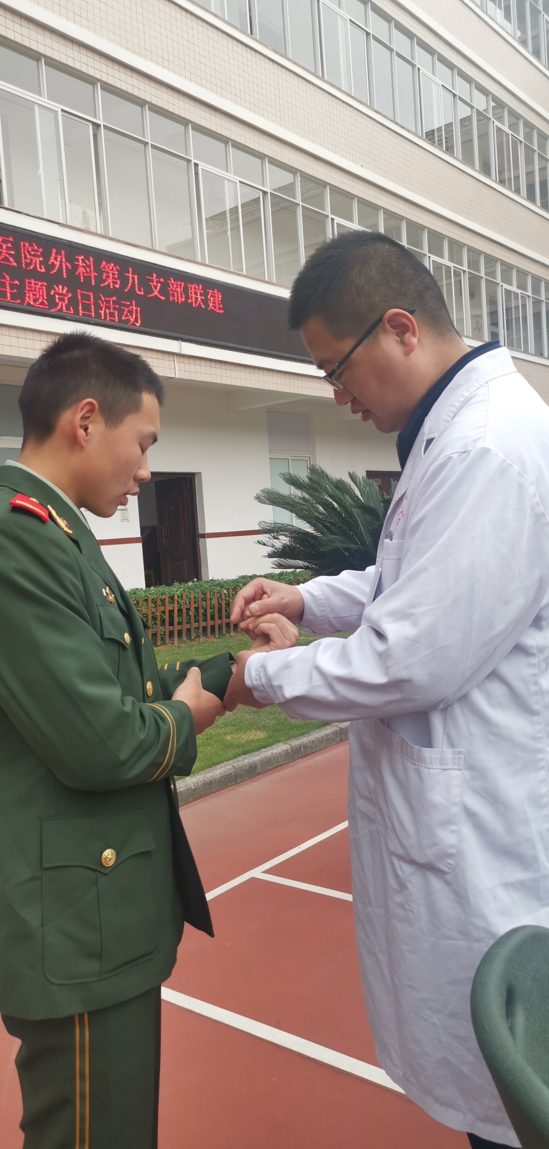 在当天的活动中,南溪山医院党委副书记张超群为部队官兵进行了党史专题讲座,护士段莎莎分享了自己到湖北抗疫的故事和日常卫生保健知识。以骨科医生为主的第九党支部的医务人员针对部队训练、生活的特点,为武警官兵提供健康咨询和疾病诊断,对一些需要进一步治疗的官兵给出了建议和方案。