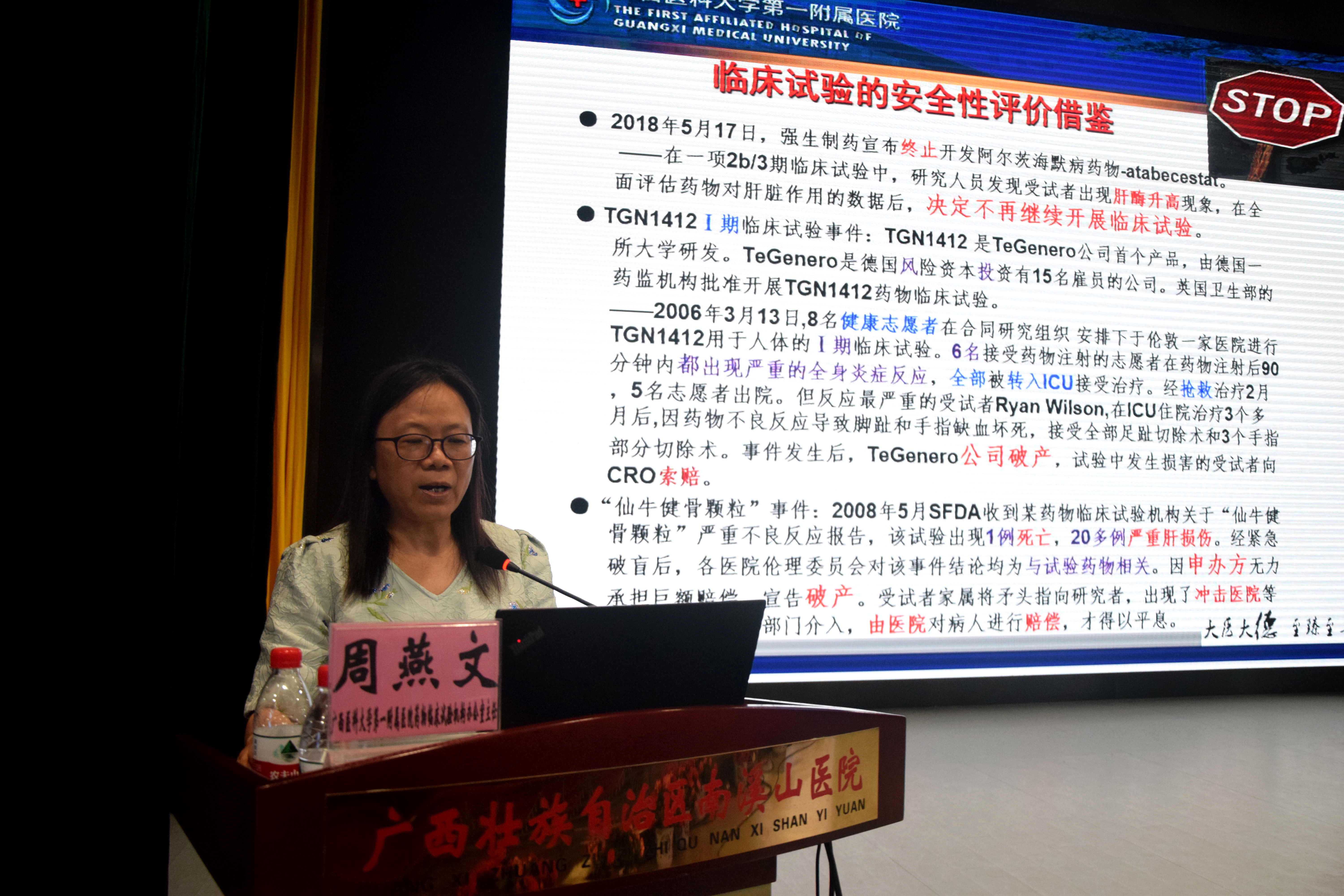 本次培训班邀请到了广西壮族自治区药品监督管理局行政审批与注册管理处处长黄祥远、广西药学会药物临床试验专业委员会以主任委员周燕文为代表的各位组委专家团队以及广西医科大学第一附属医院教授陈永斌为代表的伦理机构团队进行授课。