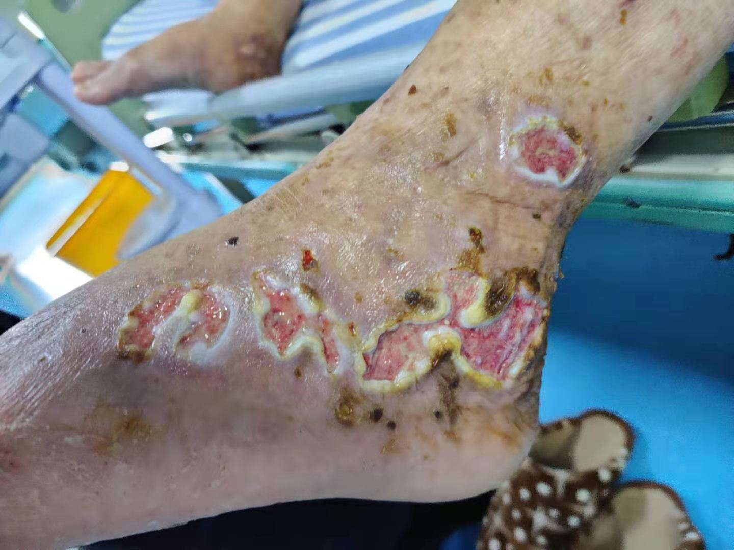 赵大爷左下肢多处伤口破溃并且感染,曾经通过手术进行清创并在当地医院换药,历经十几年,伤口创面依然未愈,于是慕名找到了该院慢性难愈性创面修复的专家黄相主任。