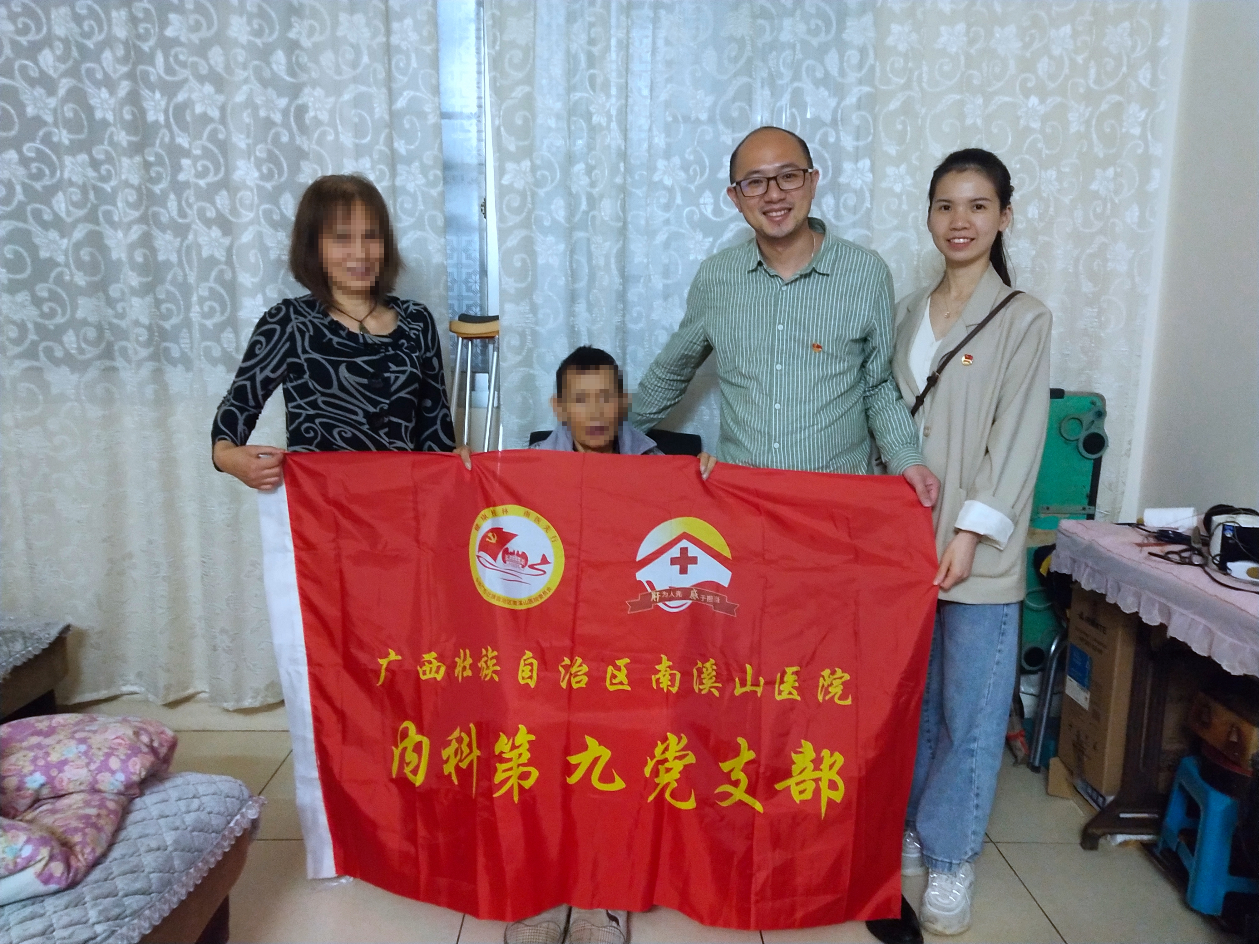 为响应院党委组织的「庆华诞 感党恩 跟党走」为主题的健康文化活动,把学党史为民办实事落到实处,5 月 20 日,广西壮族自治区南溪山医院内科第九党支部支部书记李庆辉、感染性疾病科护士长朱玉萍、护士蒋佳霖一行三人到位于八里街的出院患者罗大伯家中进行了入户回访。