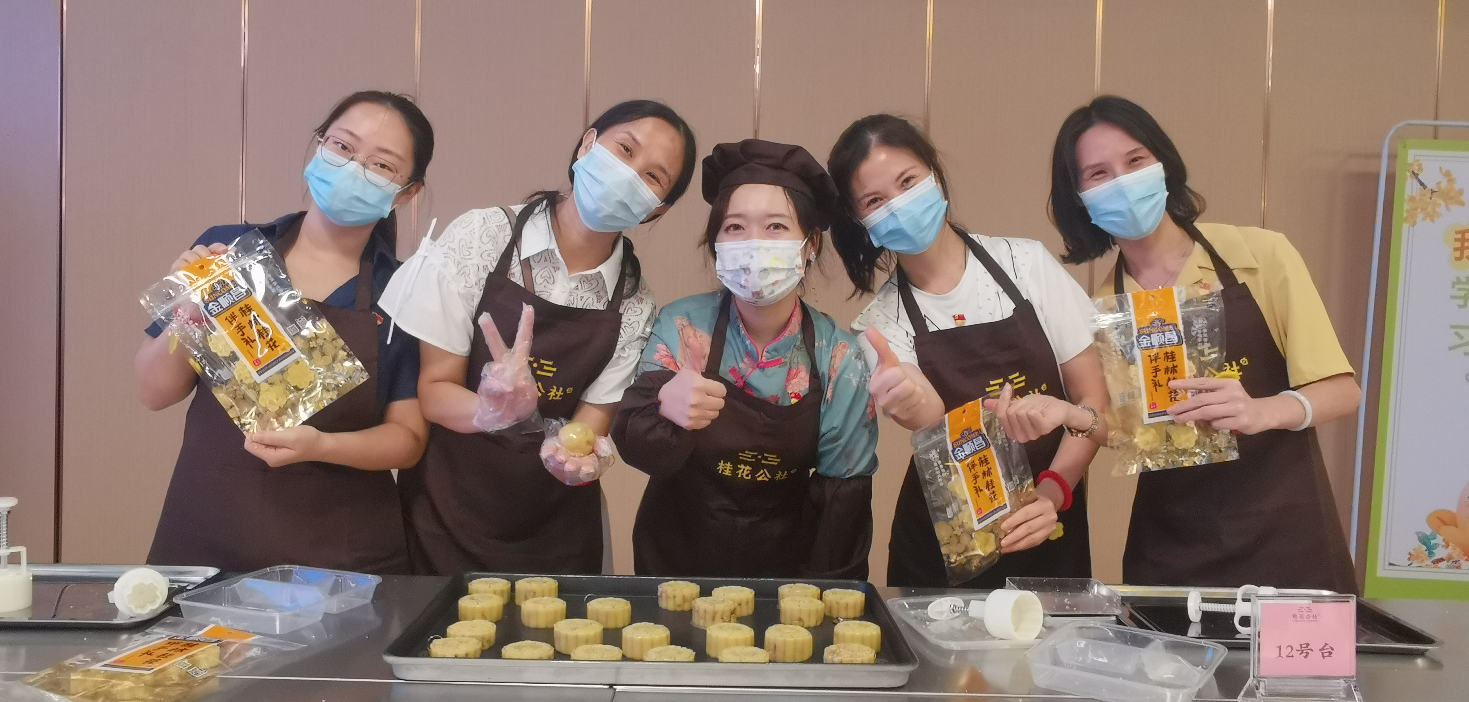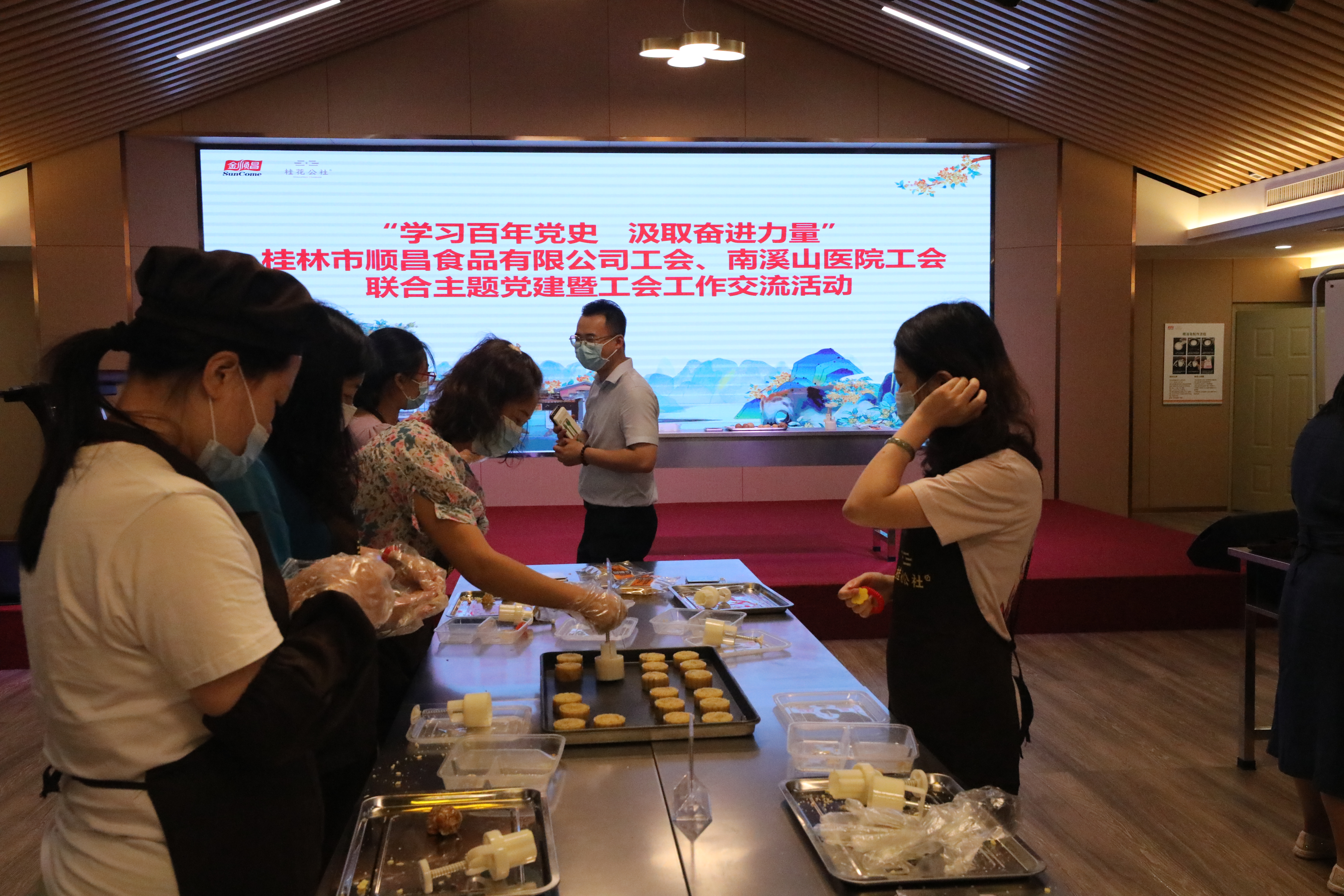 当天下午 3 点,南溪山医院 20 多名工会干部顶着烈日来到了桂林市顺昌食品有限公司的桂花公社。在该公司工会领导的陪同讲解下,医院一行先后参观了该公司的桂花文化体验馆、党史馆、女职工之家,还来到该公司的食品制作展示厅,亲自动手体验了桂花糕、月饼的制作过程。