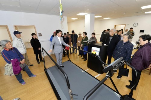 这样的非药物治疗还有很多,如多感官空间、动物疗法、回忆工坊、香薰理疗等。针对失智和失能老人的非药物治疗,还有多个康复:对行动障碍老人提供平衡训练仪、步态训练仪并提取监测数据;对长期卧床老人,通过主动和被动训练仪进行肌肉舒缓防萎缩训练。在三楼康复室,一位前来探访的老人在康复师带领下走上跑步机,机器光带迅速模拟道路上出现的香蕉皮、钱币及前方的红绿灯等仿真环境,训练老人在行走中的反应能力。仿真环境还有门把手、钥匙开门、锁门等康复训练设备。