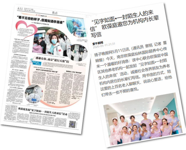 欧葆庭中国区发起「见字如面·一封陌生人的来信」活动,邀请社会各界朋友为养老机构内居住的长辈们写信。位于南京的欧葆庭仙林国际颐养中心和位于长沙的北辰欧葆庭国际颐养中心均参与本次活动,将有上百位长辈有机会看到您的来信!