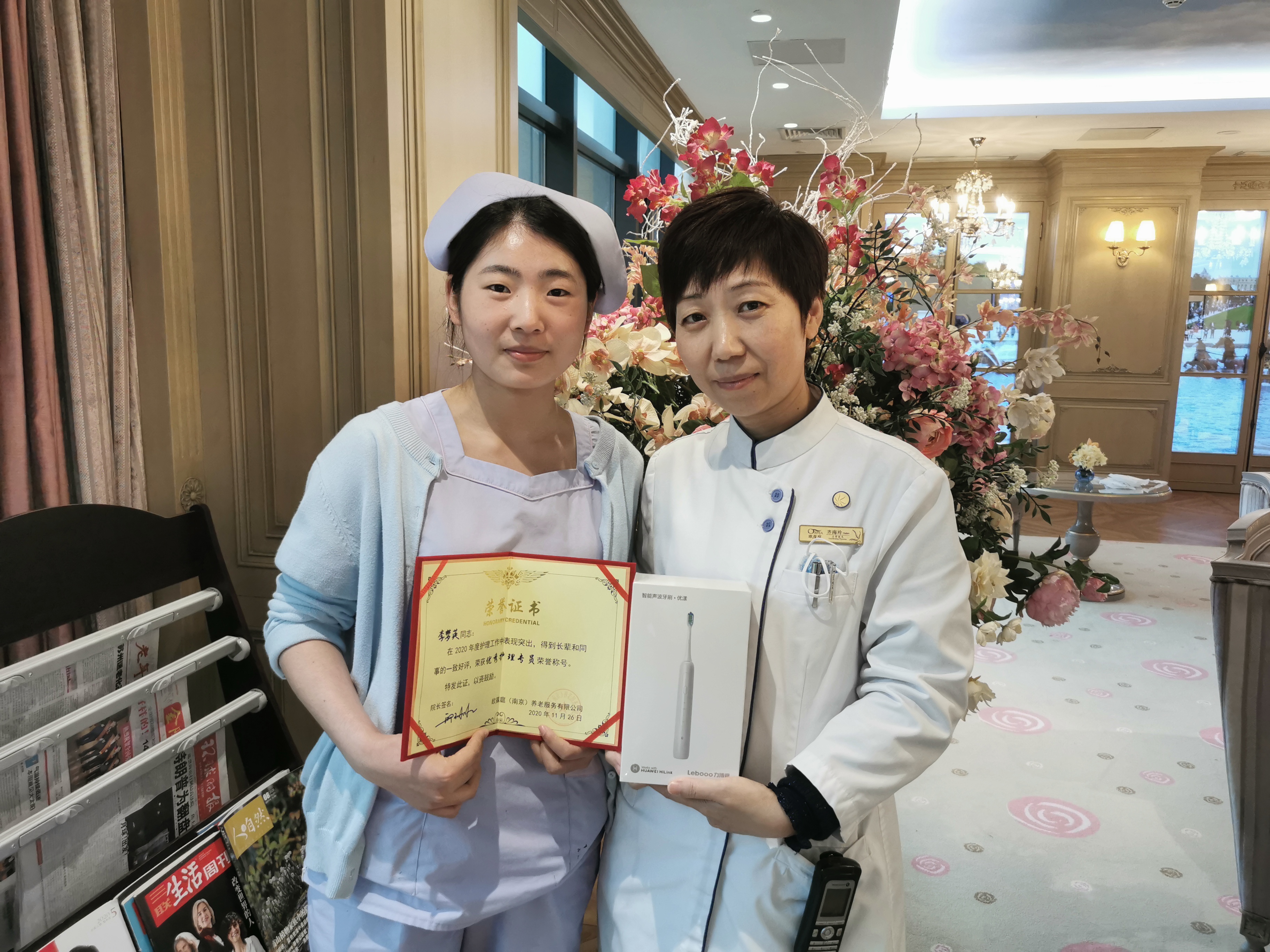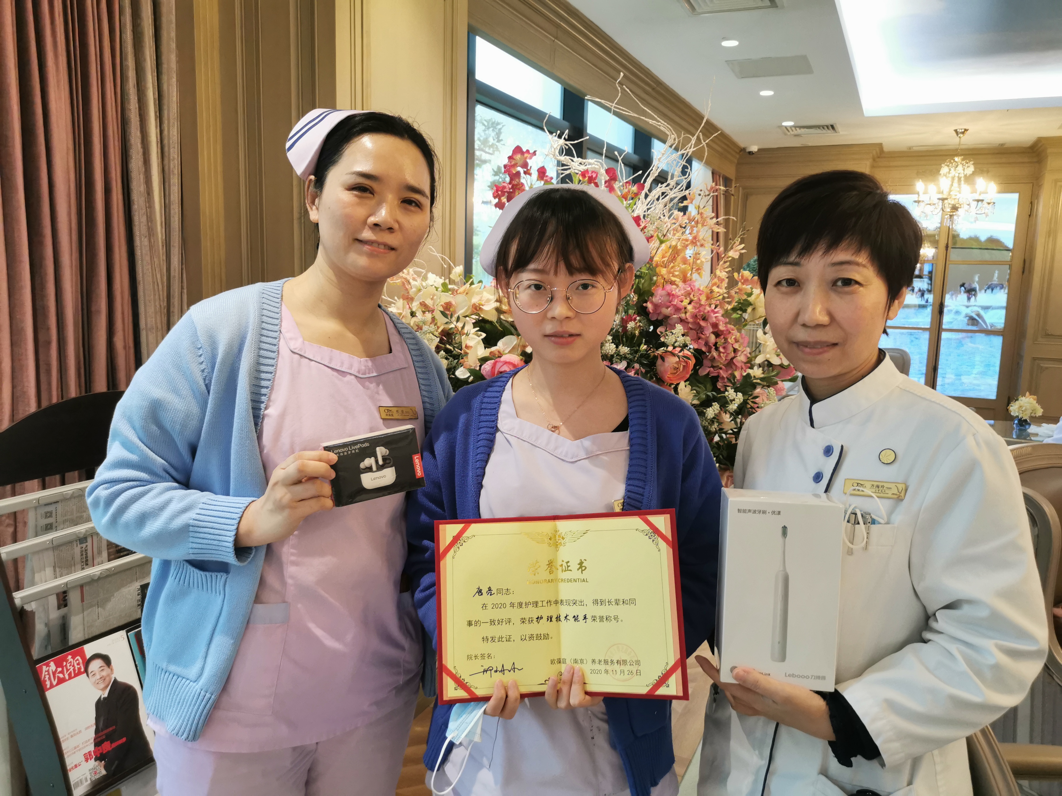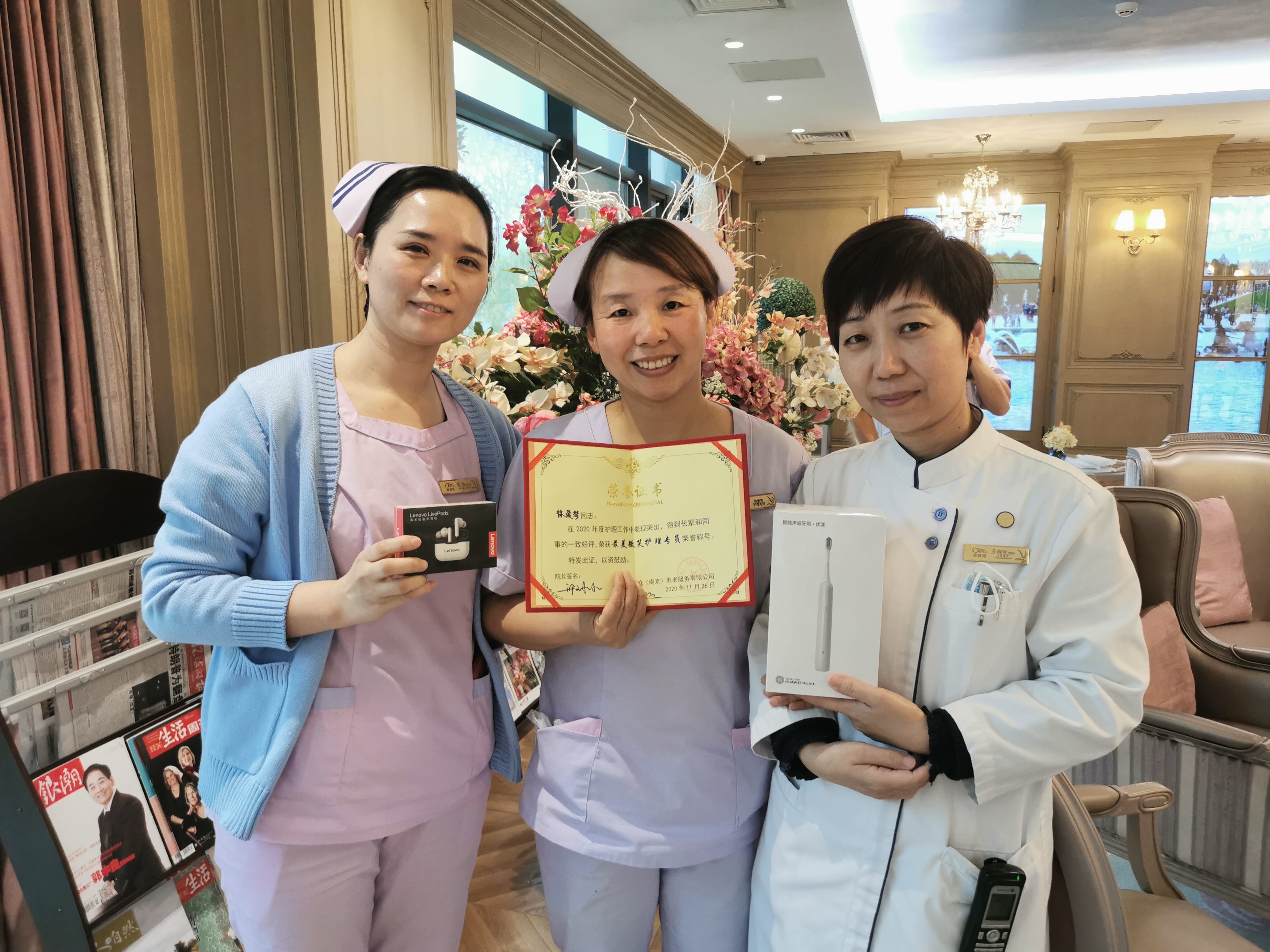 11 月 20 日,欧葆庭邀请了护理长辈、护理部护士团队、医疗部和康乐部参与评选,最终评选出 4 位获得「优秀护理专员」、「护理技术能手」、「最有爱心护理专员」及「最美微笑护理专员」称号的护理专员。投票结果公布如下:本次投票一共收到 342 票,被提名者 23 人,最终获奖的四位优秀护理专员为:李梦英、唐亮、许桂玲、徐爱琴。