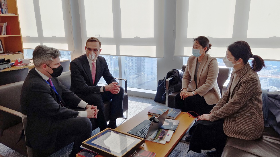 2023年1月17日,欧葆庭中国区总裁柯烨明(Benoit Garcin)先生、欧葆庭中国区首席运营官邢珊珊女士、上海欧葆庭顾村国际颐养中心院长王婷婷女士一行来到法国驻上海总领事馆,向法国驻上海总领事王度(Joan Valadou)先生送上了一份感谢信。王度先生对欧葆庭一行人员的到来进行了热情接待,并邀请了法国驻华大使馆卫生、社会事务与劳动处参赞Romain Jacquet先生通过线上会议形式与欧葆庭进行了深入交流。