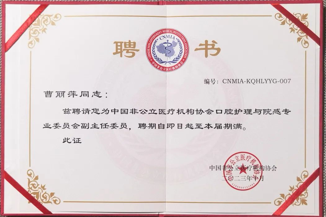 尤其值得一提的是,美维医务总监兼总裁办主任曹丽萍女士被聘任为中国非公立医疗机构协会口腔护理与院感专业委员会副主任委员,足见对其领导下美维口腔医务及院感工作的认可。