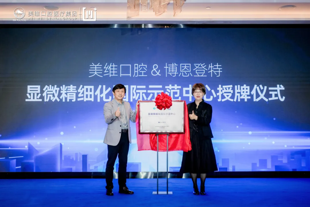 ▲博恩集团联合创始人&副总裁黎雁龙先生与朱丽雅女士共同揭牌,开启美维精细化诊疗新的里程碑