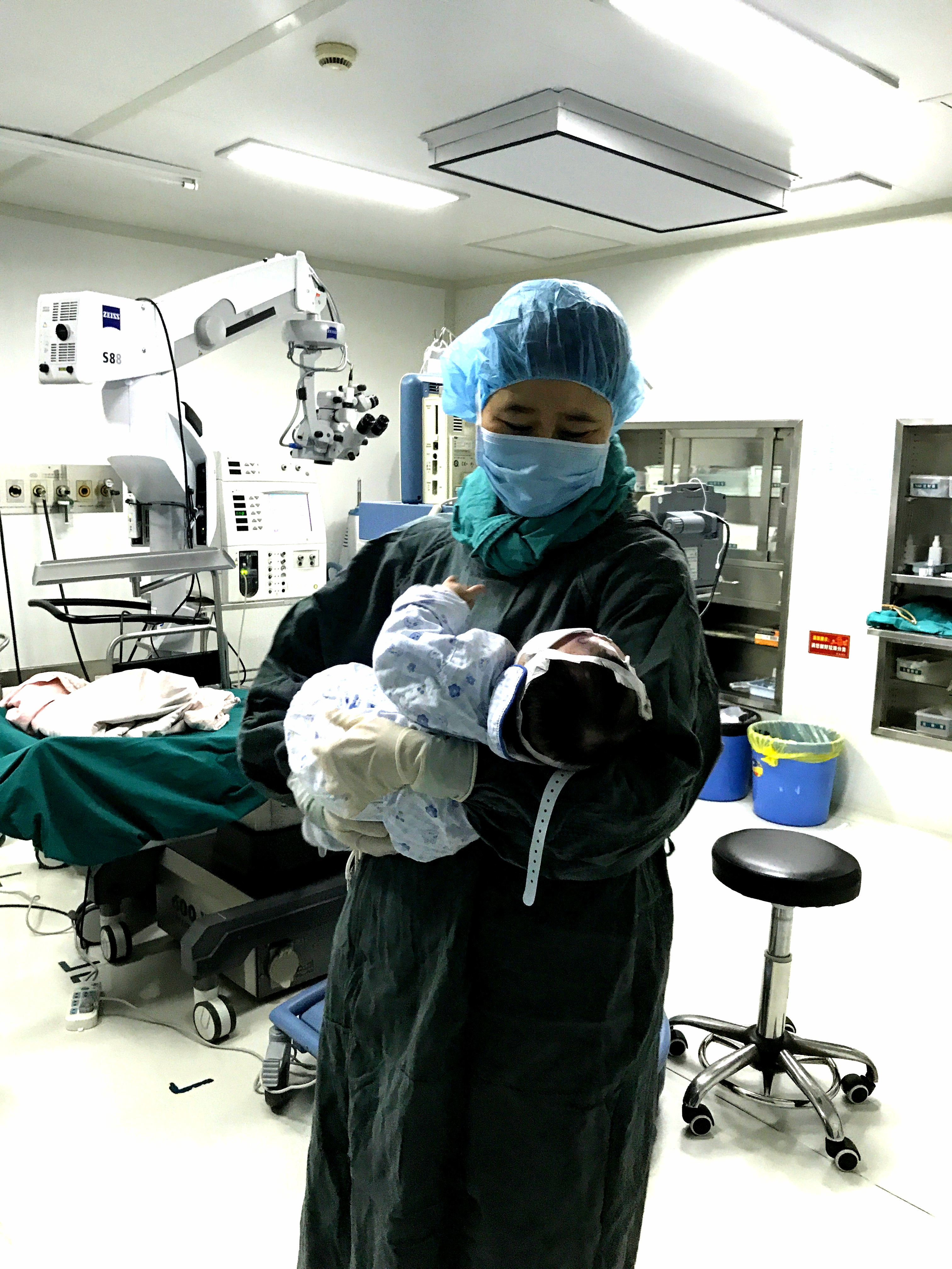 赵云娥教授轻轻抱着哄着准备做手术但仍在啼哭的小患者