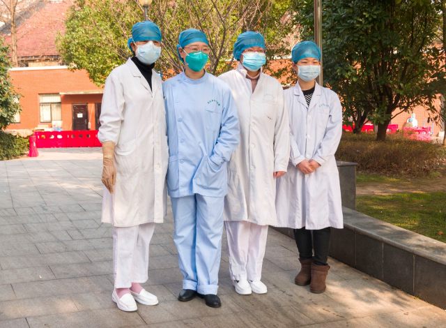 武汉市汉口医院院感科主任刘琼芳(右 1)肩负着全院感控工作的重任。从医院收治第一例有华南海鲜市场暴露史的患者开始,刘琼芳就带着科室人员开始了抗疫工作,从医院的大环境分区、病区隔断的改造到全院职工的防护培训等,刘琼芳在全院做了不下 50 场培训,期间累得几次心脏不适差点晕倒过去,但她依然坚持到最后。