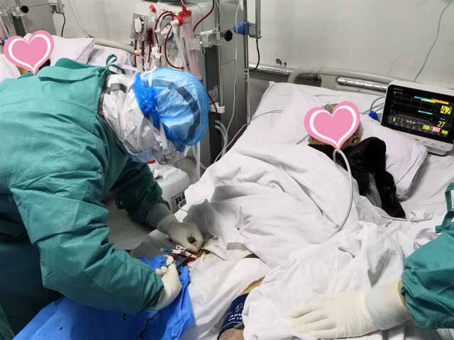 一位新冠老奶奶因难以忍受病痛的折磨在自己手腕上割了十余刀,作为一名从医 20 余年的外科医生,汉口医院骨外科主任冯世波知晓后,迅速穿好防护服,备好手术器械来到患者病床前。他安抚患者的情绪,待患者同意配合手术后,开始仔细检查伤口,消毒、铺无菌巾,在狭小的空间开始手术,病人一声声在不断的咳嗽,冯世波穿着防护服戴着护目镜,弯着腰,感觉每缝一针都无比费力!大概用时一个半小时,冯世波坚持到了最后,腰部已疼痛难忍,汗流浃背!
