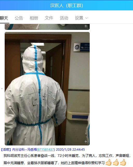 疫情发生后,汉口医院内分泌科主任胡淑芳第一个主动报名加入抗疫队伍,她连续奋战在抗击疫情的第一线十多天每天只休息 2、3 个小时。1 月 27 日接受央视采访时,这位平时被称为医院语速最快、声音最大的科主任,已经沙哑到快说不出话来了。1 月 28 日晚,她在连续工作 72 个小时后,坐着换衣服时,还来不及换完就睡着了。她说不管怎样,会坚持到底。