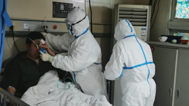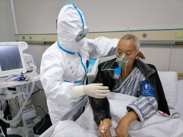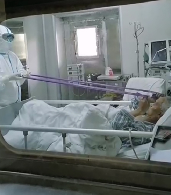 遂宁市中心医院 传染病院区隔离病房内医护人员正在为患者带吸氧面罩