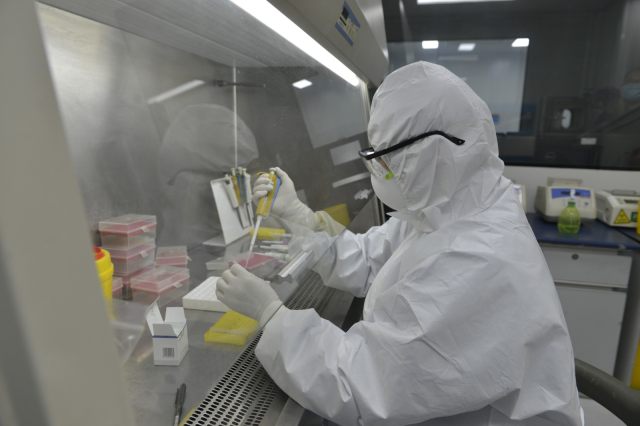 遂宁市中心医院检验科工作人员正在做核酸检测